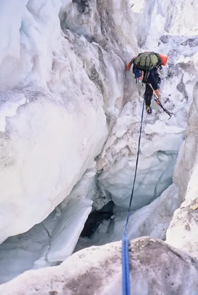 Jag säkrar Jonas genom isfallet på Bossglaciären på väg upp på Mont Blanc.