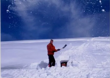 Utgrävning av snöbivack. Samuel och Tobbe gräver.
