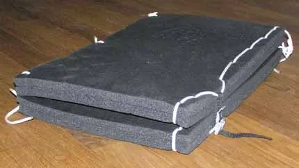 Skär en dryg paddelbredd på tvären av ett liggunderlag, skär fyra bitar (två av bitarna kan man låta hänga ihop genom att man inte skär hela tjockleken, så får man ett gångjärn). Tråckla ihop, så har du ett underlag som kan vikas ut till rejäl yta, samt en flottör som är uppblåst hela tiden. Lätt att förvara på däcket.