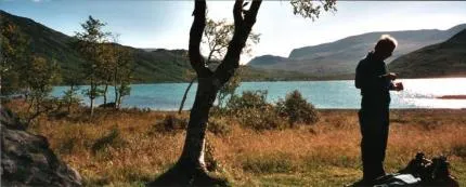 Lennart i motljus mot Gjendesjöns gröna vatten.