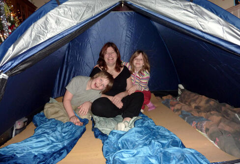 Upp med tältet inne i köket (lite för kallt ute), bädda med madrass och täcken, in med dom nya sovsäckarna ...