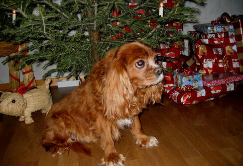 Mot alla odds-här är hon igen,under granen,vår älskade lilla julhund.Ännu lite blöt efter julbadet.