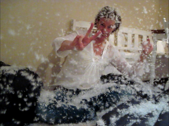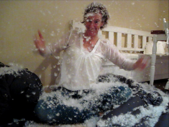 Idag var det dags igen. Idag gjorde jag på det kul sättet. Jag klippte upp hål direkt, körde in handen och tog en rejäl klump och petade in i sovsäcken som skulle bli lite varmare. Dunet yrde.