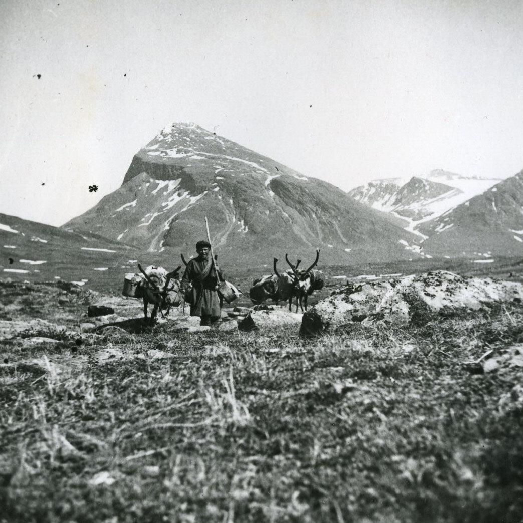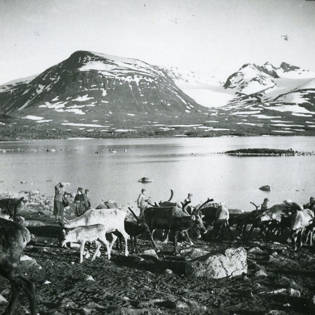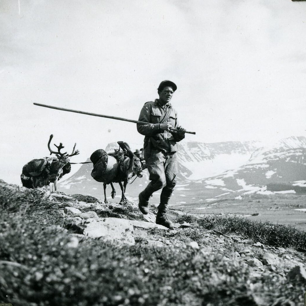 ”Renarna klövjas i Rinim, juni 1945”. Klövja innebär att lasta djur med packning som fördelas i jämvikt på båda sidor. Foto: Israel Ruong (Isof, ULMA 18396). Karta