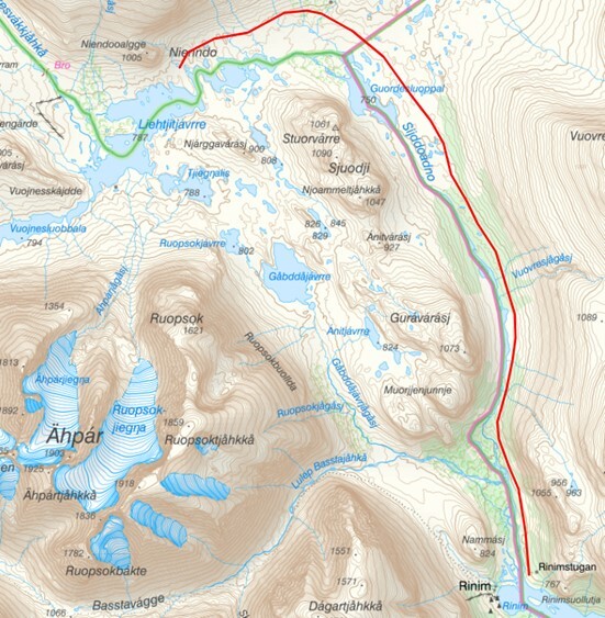 Här var det för mig först oklart vilken väg de tog från Rinim till Nienndo. Rodde de över till östra sidan av Sjiddoädno? Ruong har inga foton från den här delen av färden. I den gamla Generalstabskartan finns utritat två flyttvägar.