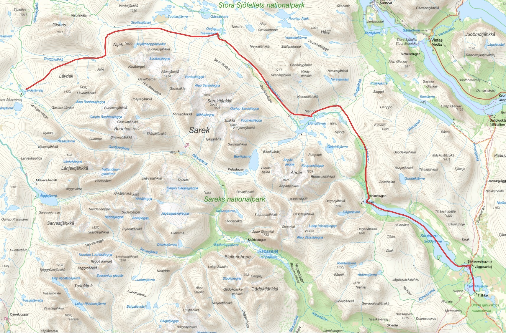 Kartan visar vägen längs Suottasjjåhkå. Jag gissar att Suottasjjåhkå har kallats Sjnuvtjudisjåhkå. Den fortsatta färden gick runt Niják och kom aldrig att komma i närheten av Sjnuvtjudisjåhkå så som denna jåhkå är definierad idag.