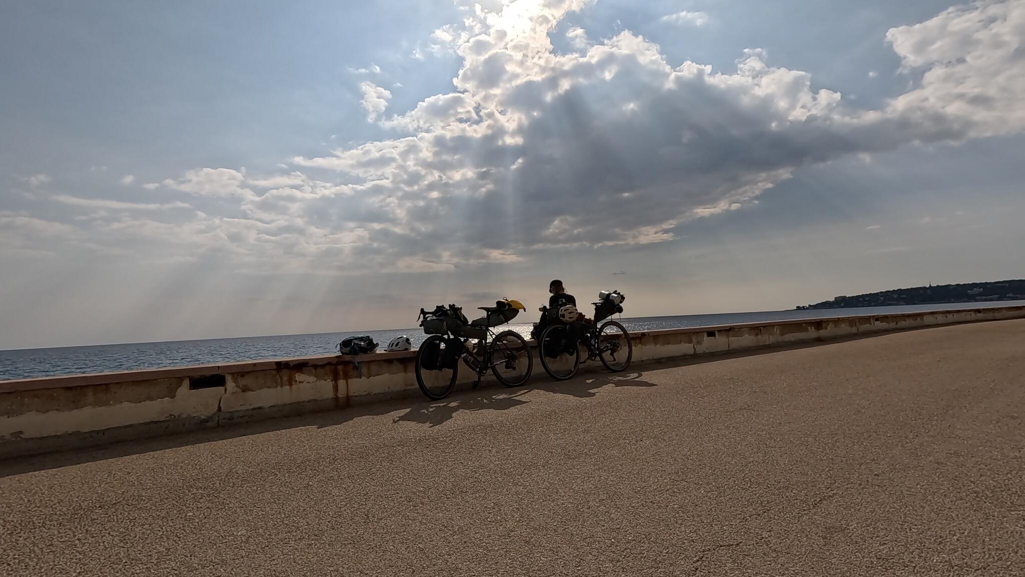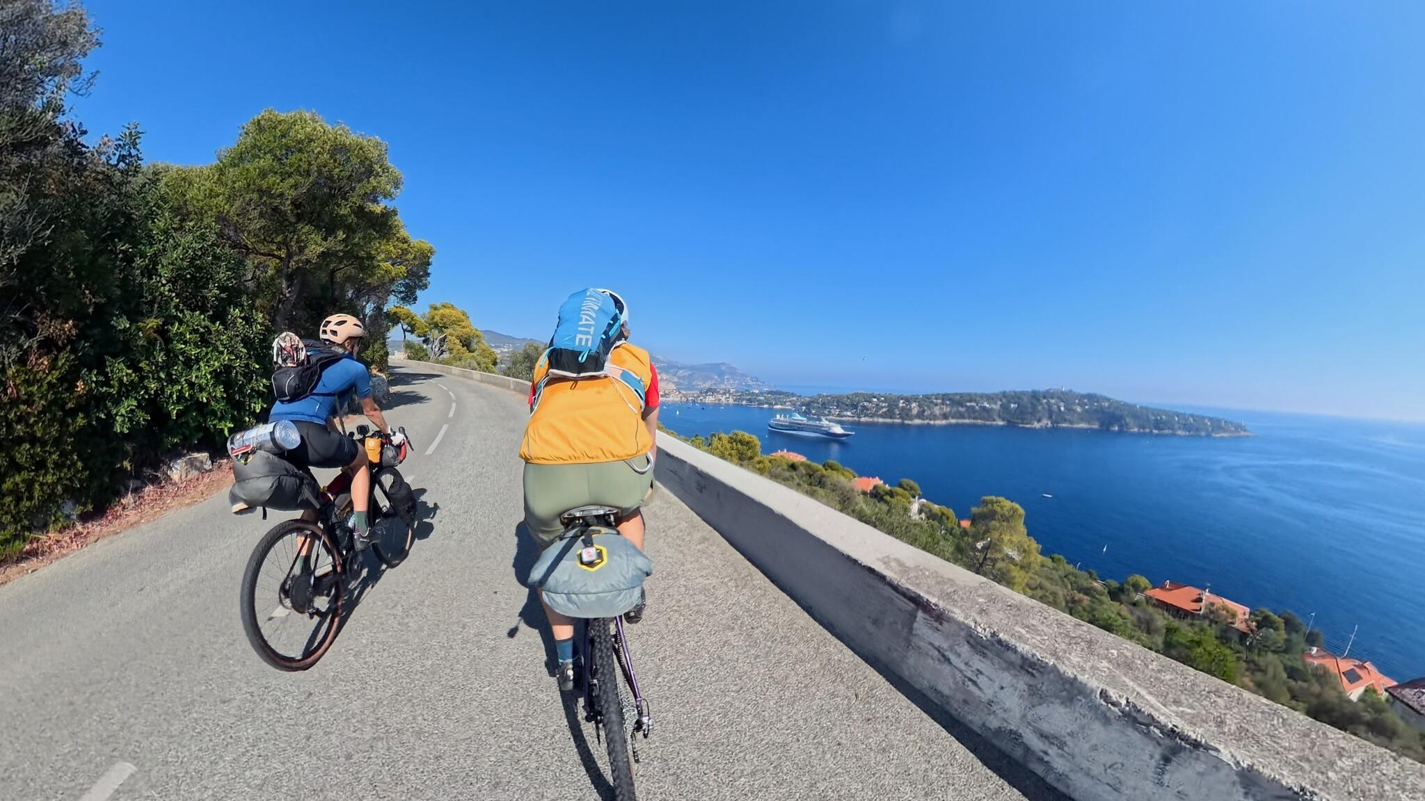 När vi vaknat till liv i den trevliga damens trädgård cyklade vi söderut ner mot kusten. Efter ett stopp för kaffe var vi snart i Ventimiglia. Därifrån följde vi kusten, och solen mot Antibes. Under hemfärden passerade och stannade vi i bland annat Menton, Monaco samt en obligatorisk fika på Cafe du Cycliste, speciellt för mig som tidigare inte varit i Nice på två hjul. Hemkomsten till Antibes firades med en pizza. En välförtjänt sådan.