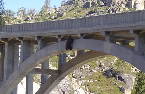 Uppe vid Donner Summit nära Truckee i Sierra Nevada-bergen (där jag förövrigt lärde mig klättra en gång i tiden) hade en björn kommit ut på en bro. Ett par bilar kom, björnen blev rädd och hoppade ... över kanten. Märkligt nog lyckades den klamra sig fast och kröp sedan upp under bron, där den återfanns sovande dagen efter. Man riggade ett nät, sövde den med pil så den ramlade ner i nätet, som sedan firades ner och den återfick friheten.