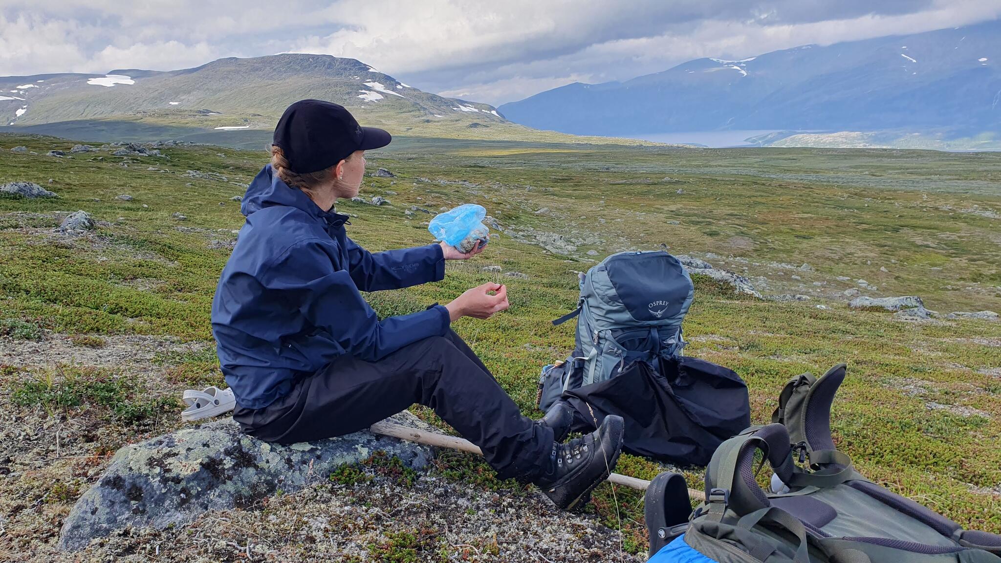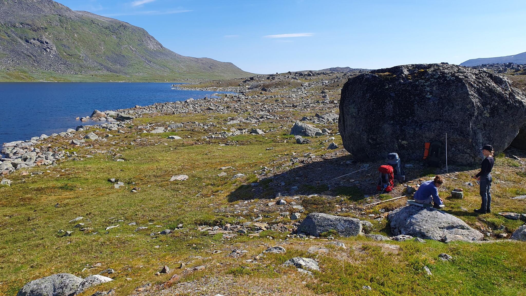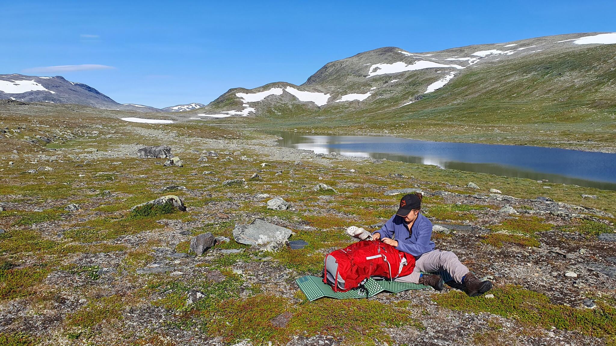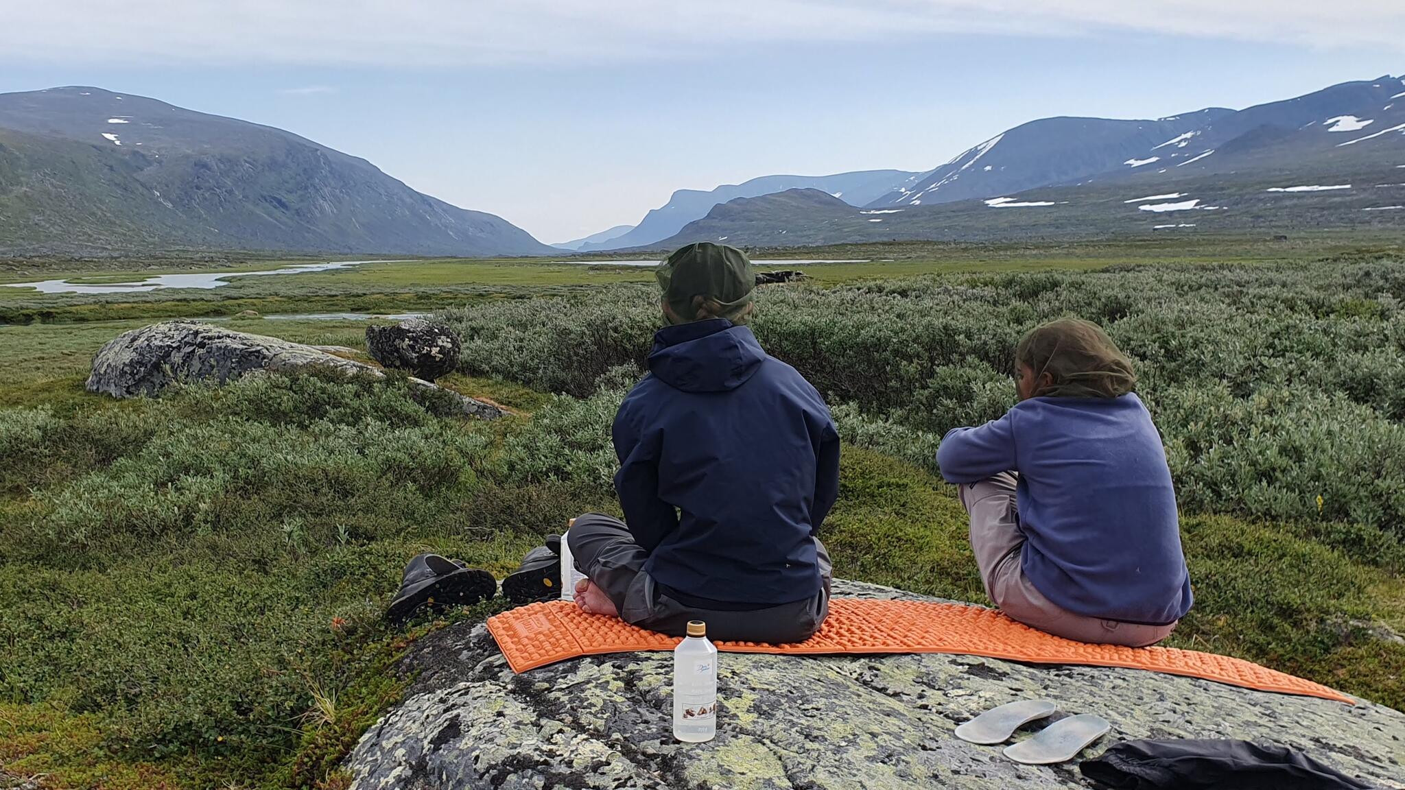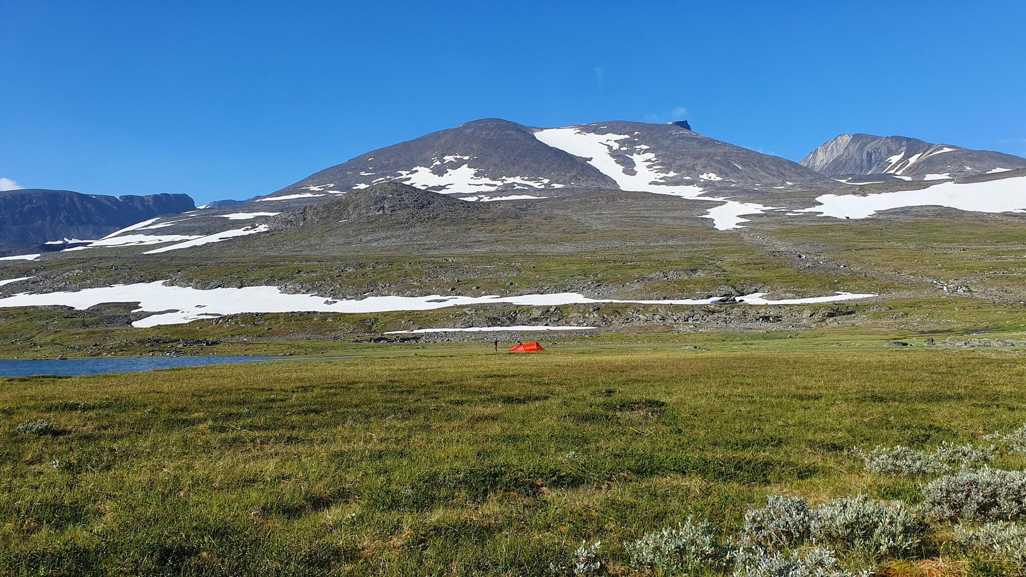 I detta totala stenlandskap ovanför branten ner mot Guhkesvágge lyckas vi ändå hitta en yta med plan barmark och vatten ur Tjievrajågåsj på promenadavstånd. Vi är så tacksamma för att det är klart väder så vi kan se hela det omgivande landskapet.