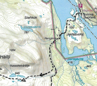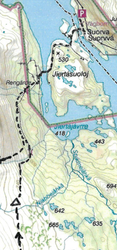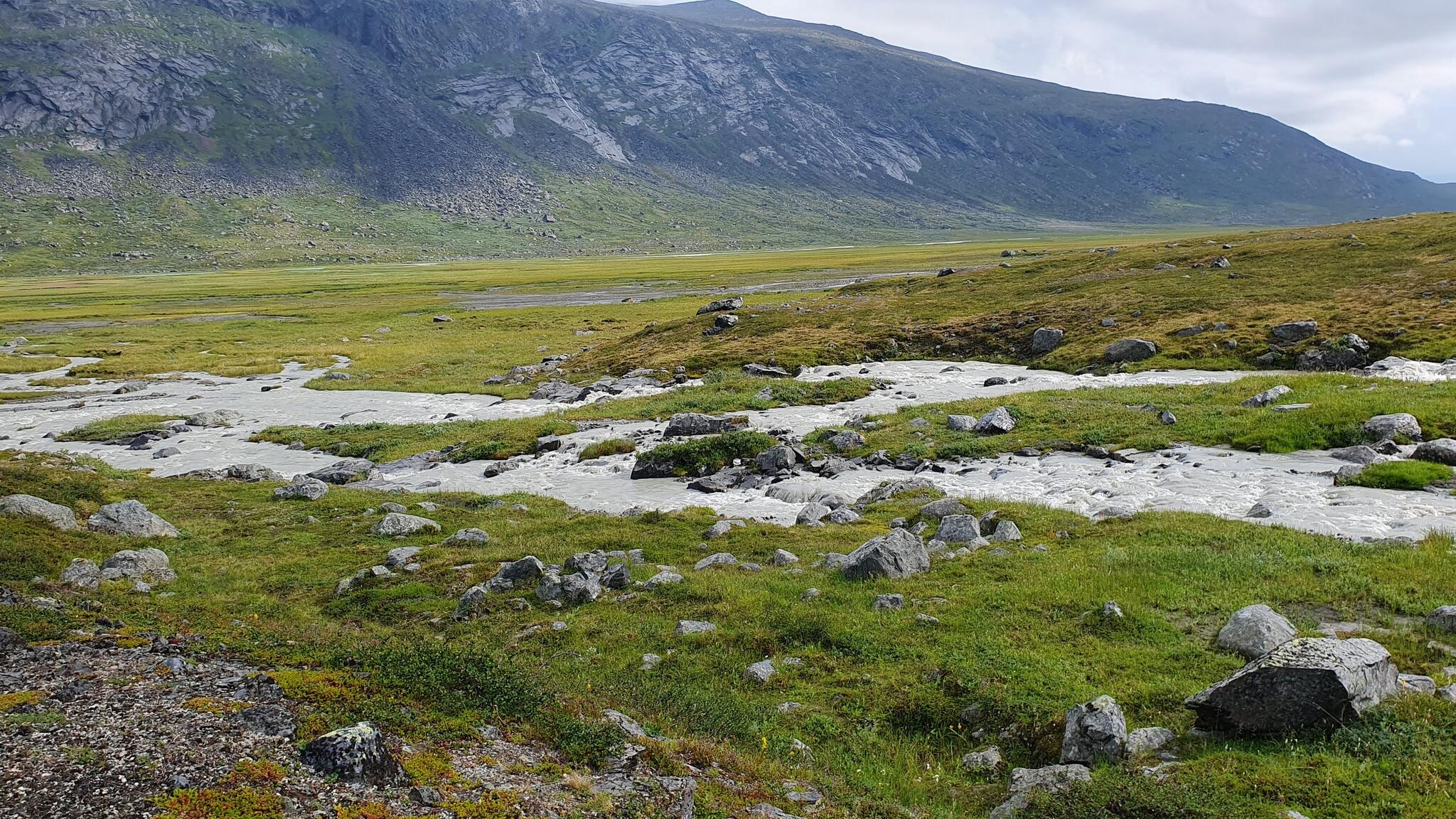 Inledningsvis vadar vi vattendraget som utgör inlopp till Sarekjávrásj. Sen går vi i riktning mot berget mellan de två parallella jokkarna mellan höjderna 1357 och 1288.