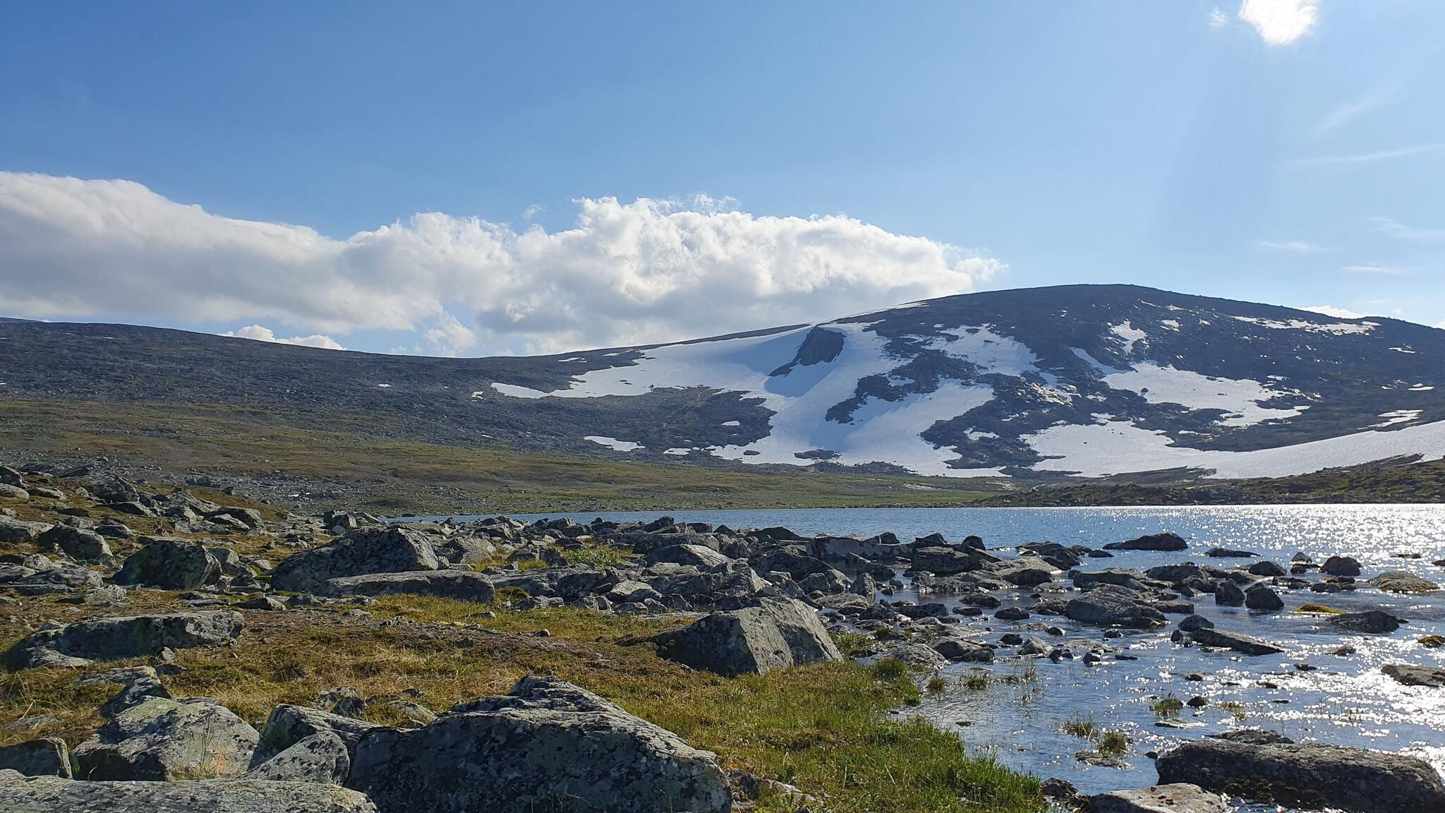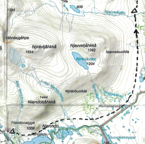 Det måste vara mer vatten nu jämfört med 2008 på turen med sonen. Jag tänker att den stora skillnaden måste betyda att det då var det motsatta, det vill säga ovanligt lite vatten. Jag kan inte minnas att vi då vadade något vattendrag på sträckan förbi Nienndo och Njavvebuollda. Möjligen då Njavvejågåsj men inte på något brett ställe. Desto blötare idag. Lärorikt att det kan vara sån skillnad.