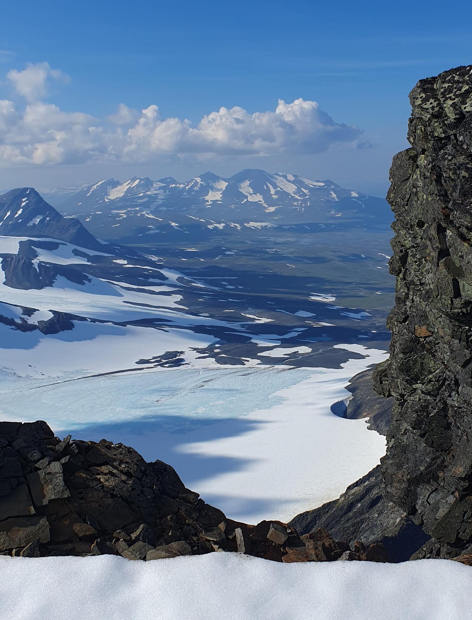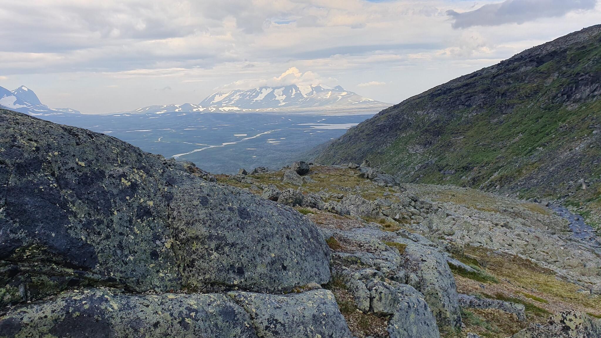 Den första belöningen kommer när vi når kammen och tittar ut över grytan som omges av Nordtoppen, Stortoppen, Sydtoppen och Buchttoppen med Gasska-Sarekjiegna i botten. En mäktig syn.