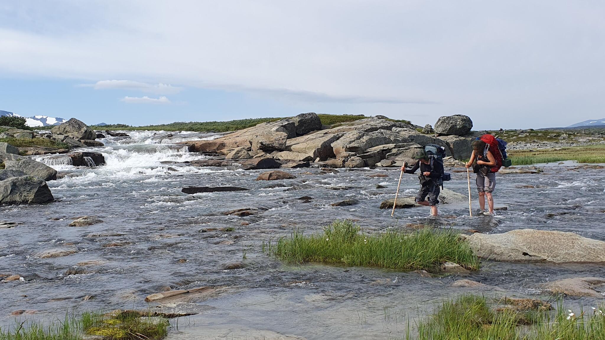 Då vi sedan närmar oss och fortfarande på håll spanar efter lämpligt vadställe får vi syn på några som verkar vara i färd med att ta sig över från andra sidan. Vi går ditåt. I mötet med dem när de har kommit över tycker jag mig känna igen en youtuber jag följer, och visst är det Fjäll-Anders, han som fastnar i stormar och uppfinner i garaget! Kul att träffa honom.