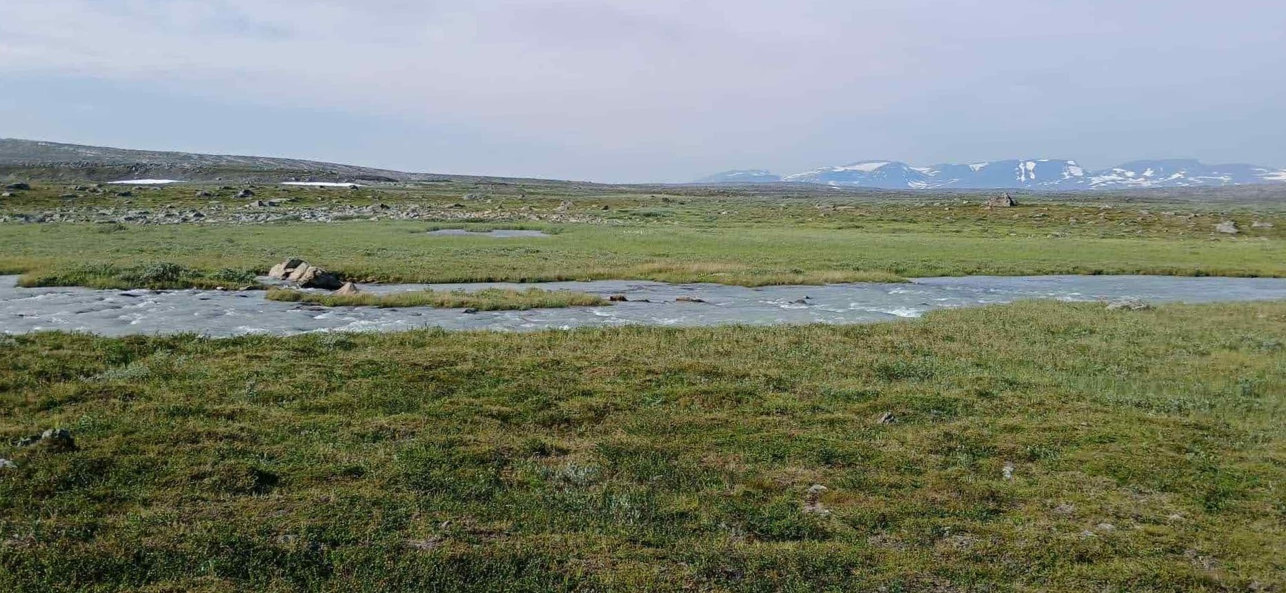 Vi sätter som mål att hinna vada Njavvejågåsj innan vi ska stanna för kvällen. Sista biten fram till den går på härlig lättvandrad jämn hedmark. Vi stannar och sätter oss för en kort paus när vi kan se ner mot jokken.