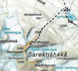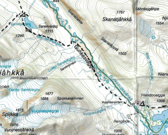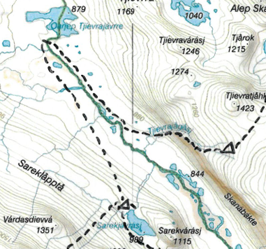 Ett par kommentarer. Jokken ni tog er över direkt efter passagen över Guhkesvákkjåhkå söder om Oarjep Tjievrajávrre saknar namn. Den får sitt vatten huvudsakligen från Gássajiegŋa. Nästa jokk ni vadade är Várdasjåhkå. Därefter ännu en namnlös jokk som på Calazos karta heter Alep Sarekjågåsj. Lantmäteriets "Alep Sarekjågåsj" har fått namnet "Gasska Sarekjågåsj" av Calazo som följt Tore Abrahamssons namgivning. Lätt att bli förvirrad.