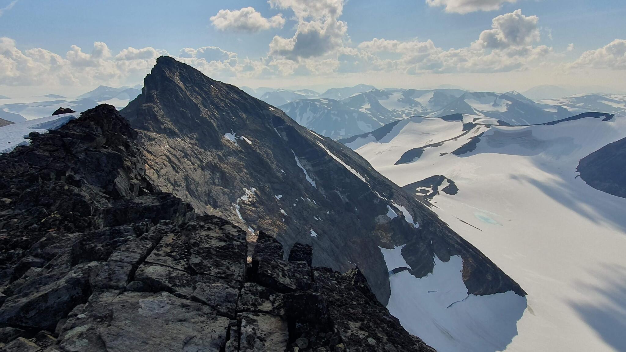 Uppe vid toppen slutar, eller börjar, snöfältet strax innan kanten mot nordväst som är ett hisnande stup. Stenkanten leder vidare mot Stortoppen. Snöfältet gör en mjuk och allt brantare båge ner mot Gasska-Sarekjiegna.