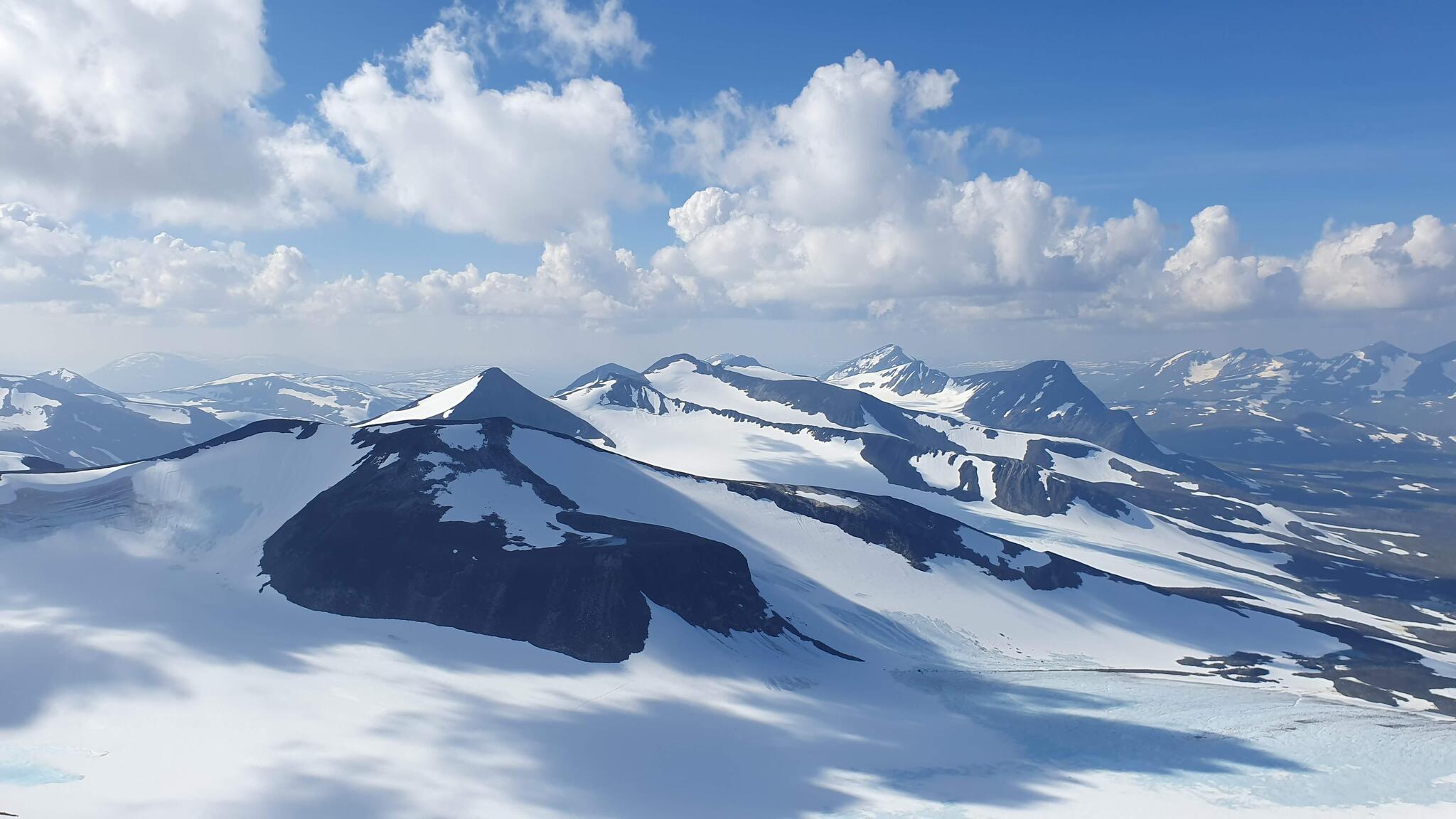 Glaciärerna och topparna i Sarektjåhkkåmassivet mot nordväst. Áhkká längst bort till höger.