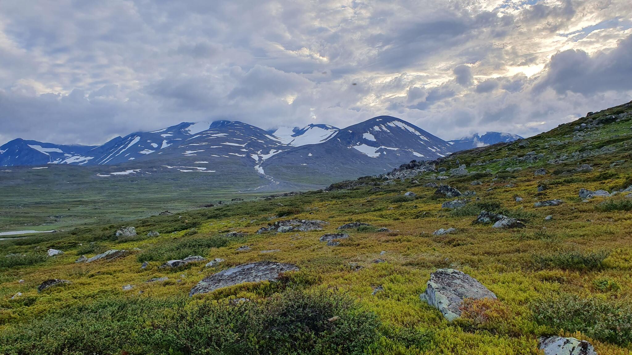 Det är onekligen en storslagen syn som uppenbarar sig när man kommer över passet och topparna i Sarek träder fram.