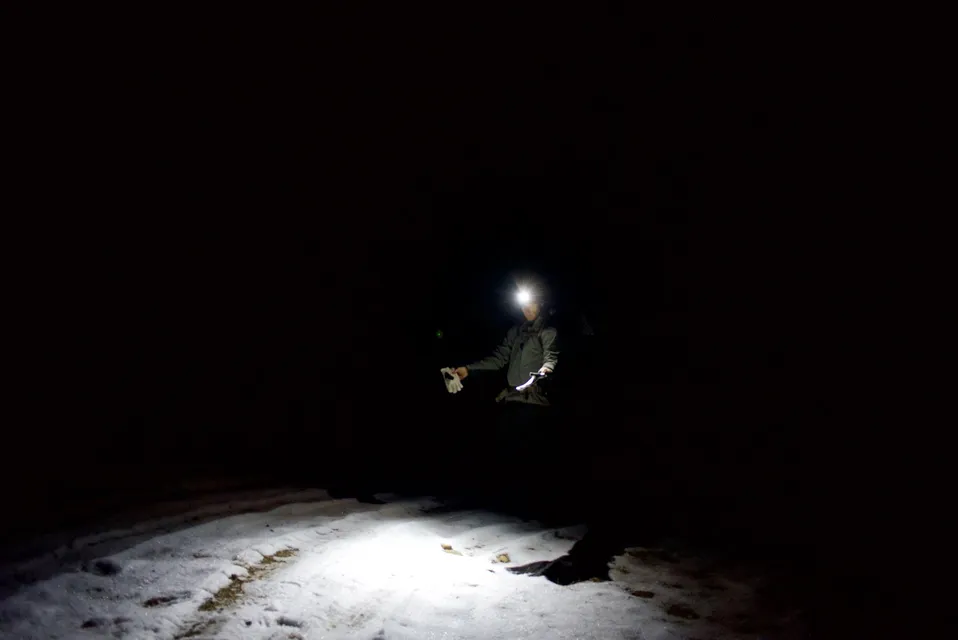 Jag packar ryggsäcken framåt kvällen för en enkel övernattning i skogen ett par mil utanför Skellefteå. Redan vid fyratiden på eftermiddan börjar det vara mer eller mindre svart ute, och jag får leta mig fram i pannlampans sken. Det är något märkligt med att vandra i skogen i mörker. Det begränsade synfältet som ljuskäglan skapar får en att fokusera på vägen, och man vandrar förvånansvärt enkelt, liksom genom en ljustunnel utan att bekymra sig så mycket åt vad som finns runtomkring.