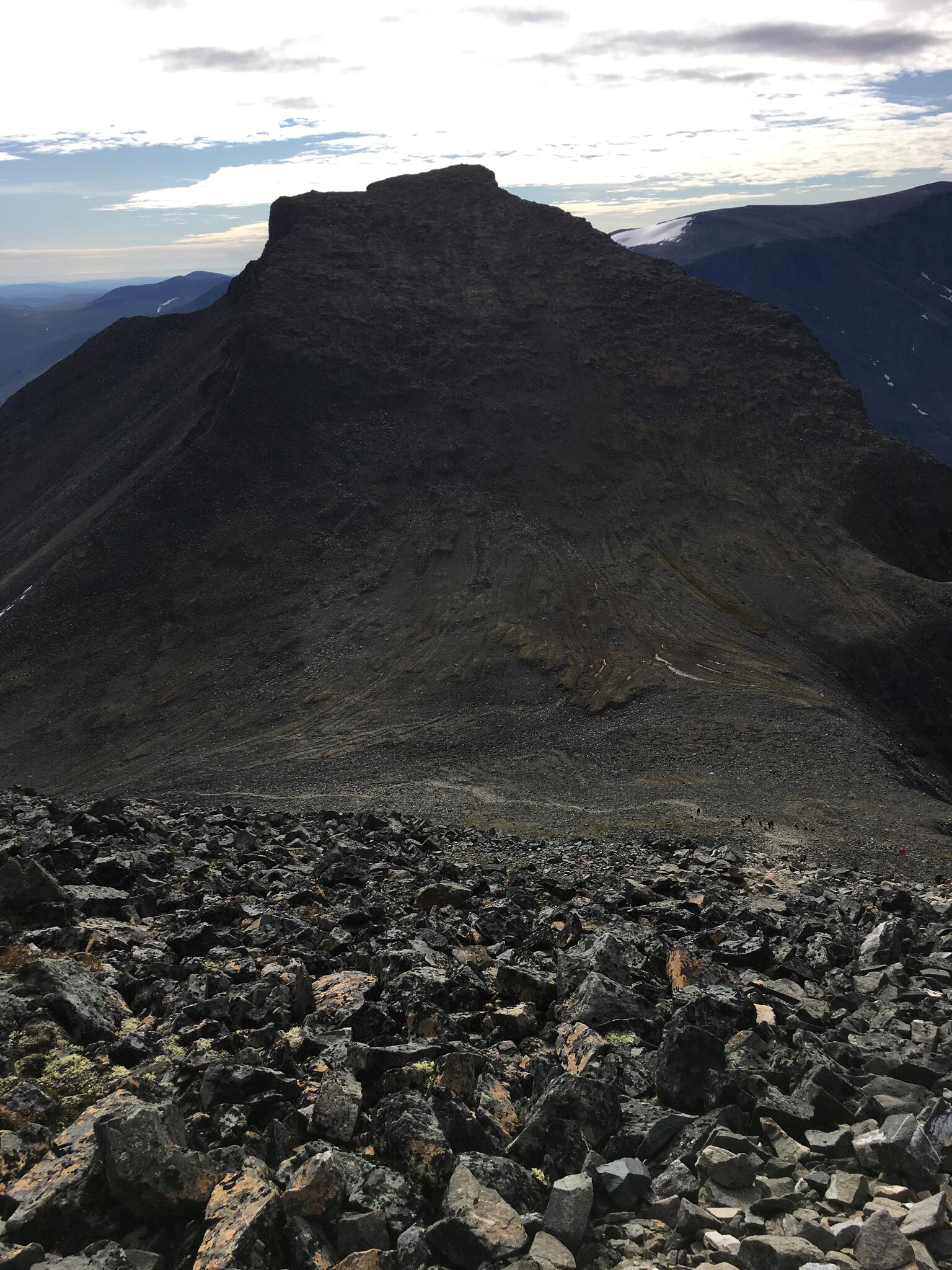 Duolbagorni från "baksidan", nordvästra sluttningen sedd från Vierranvárris sydöstra sluttning. Västra leden i passet mellan Duolbagorni och Vierrenvárri.
