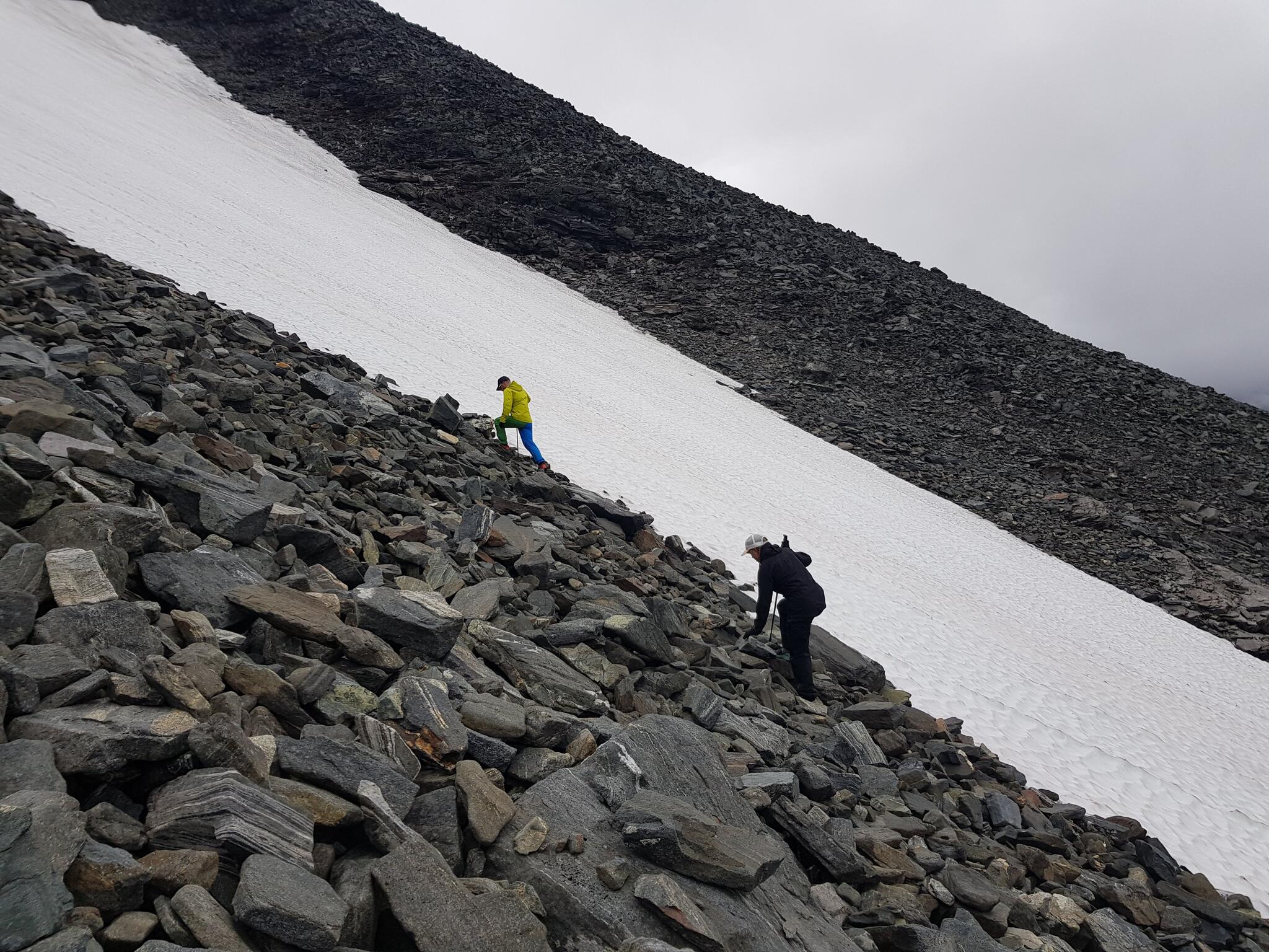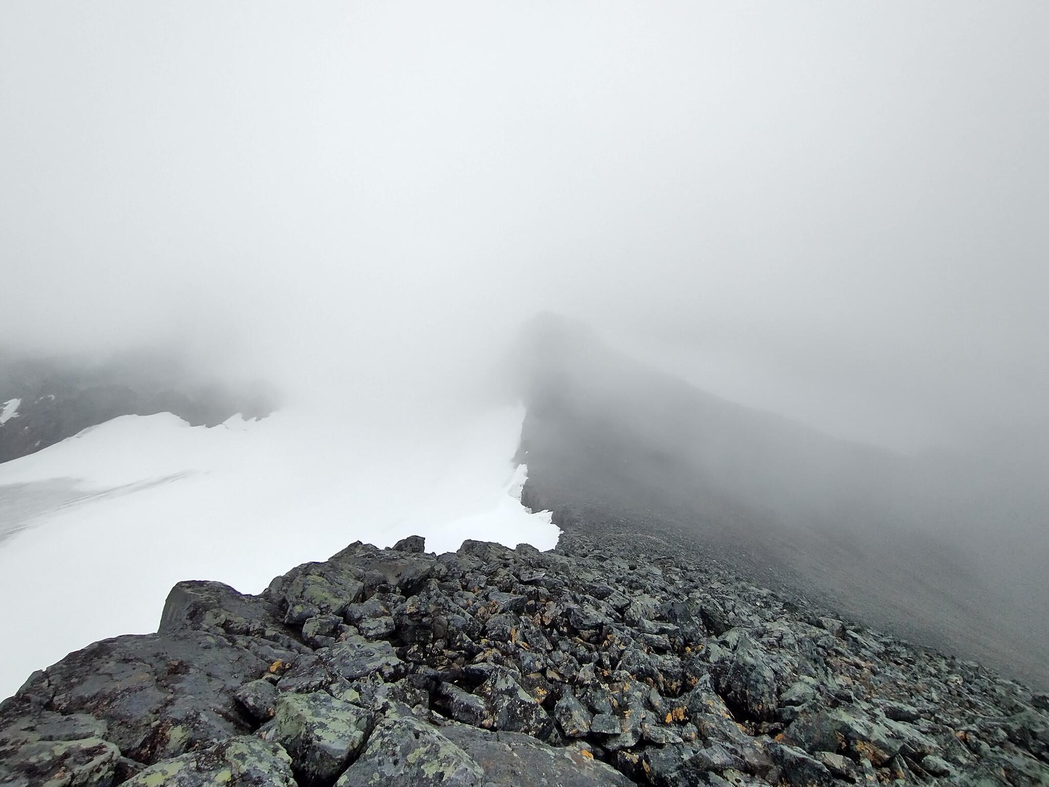 Vi går uppåt längs det östra snöfältets västra kant. Det är ganska brant men inga problem då underlaget ger gott fäste. Stenarna något rundslipade och inte särskilt hala. Ju mer höjd vi tar desto brantare blir det. Nu skingras de lågt liggande molnen för ett tag och vi ser tydligt ett krön. Det ser ut att bli mycket brant precis innan krönet, men vi kämpar på. Branten visar sig inte utgöra några problem, förutom att en och annan sten rasar ned. Den sista biten upp till krönet får vi scrambla.