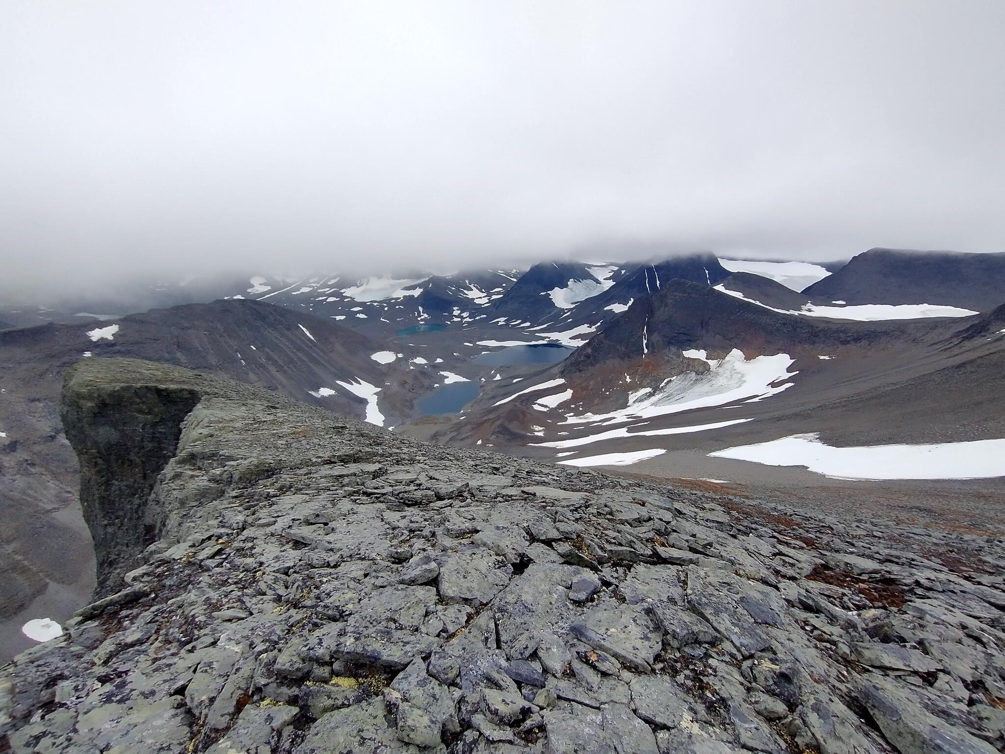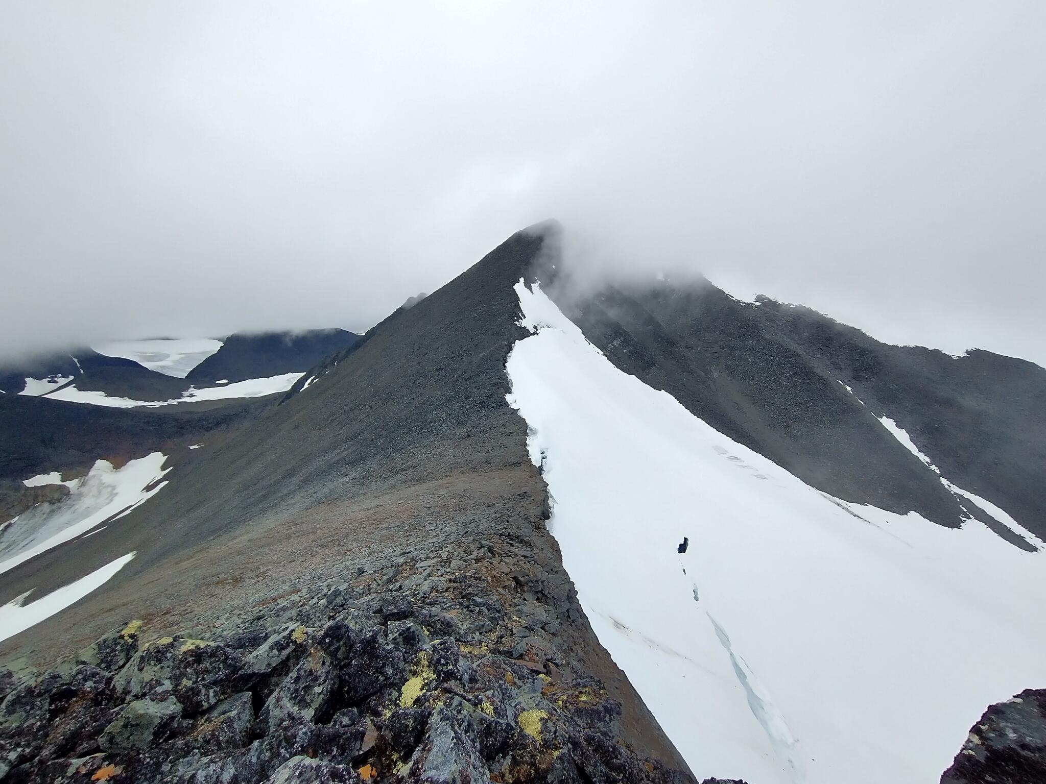 Den sista biten upp mot toppen är egentligen inte svår. Stenarna är stora (från någon halvmeter till halvannan meter i diameter) och ganska vassa, så man får se upp var man sätter fötterna. Ibland anar man minimala spår efter en stig. Går man för långt åt nordöst stupar det plötsligt lodrät något hundratal meter ned till Siehtagasglaciären, så vi håller oss ett tiotal meter längre sydväst och följer kammen upp. Efter en halvtimmes vandring/scrambling är vi plötsligt framme. Toppröset, med en smal upprättstående sten. Det är det. Molnen ligger täta och vi ser inte mer än några meter i varje riktning. Plötslig plingar det till i telefonen. 4G! En rad meddelanden strömmar in. Det stämde alltså, det som en stugvärd i Vistasstugan påstod förra året – man har god täckning på Šielmmáčohkkas topp. Vi ringer ett videosamtal till familjen. Visst hackar det något och visst är bilden inte HD-upplöst men det är kul att se deras ansikten när vi ringer och berättar att vi står på Sveriges 12e högsta topp. Även om det knappt blåser och inte regnar är det inte supervarmt på toppen. Vi tar lite bilder och beger oss sedan nedåt igen.