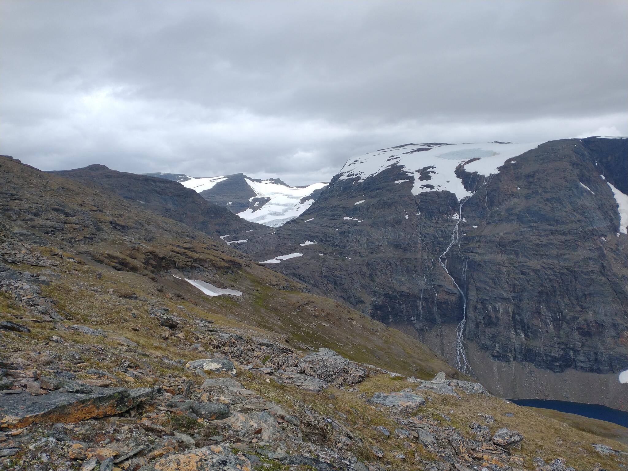 Vi kommer ned till de två sjöarna öster om bergstoppen 1391, går mellan dem och följer den norra sjöns östra kant. Dåligt val. På vägen ned i dalen som sjöarna ligger i har vi gått över ett eller ett par snöpartier som känts bra, men här nere i dalen täcks den tänkta färdvägen av ytterligare snöpartier. De är ruttna och trots att vi ser en del spår på dem vågar vi inte beträda dem då risken för ofrivilliga bad känns överhängande. I stället tar vi oss mödosamt upp för de klippiga partier som reser sig vid sjöns östra sida. I regnet, blåsten och dimman känns det inte helt tryggt, men vi kommer efter ett tag upp på en höjd där marken planar ut något. När dimman momentant lättar ser vi ned norr om den nordligare av de två sjöarna och konstaterar att det även här ligger ett parti med snö som ser rätt rutten ut. Vi följer istället Bajip Gohpáčochkkas västra utlöpare tills snön tar slut och viker av västerut ned på leden igen. Här är leden tydligt upptrampad och den sista biten fram till Louktatjåkka fjällstation går snabbt.