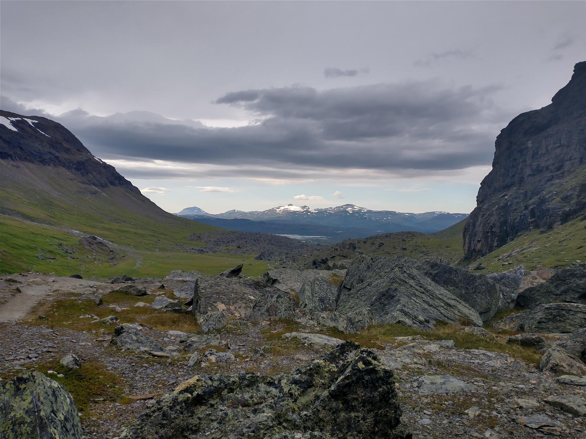 Upp mot Trollsjön (Rissajávri) genom Geargevággí. Till vänster ses utlöpare från Geagečorrumassivet och till höger ses Vássečohkka. I mitten anas fjället Biran. Norrut i Geargevággi. I fjärran anas fjäll i Norge. Högre upp i Geargevággi ses stora stenblock kringkastade av forntidens isar. Nordnordvästlig riktning.