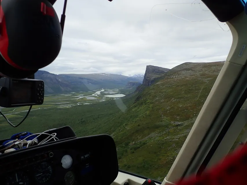 Dagen har redan bjudit på ett antal starka upplevelser. Bussresan från Gällivare, där lugnet äntligen börjar lägga sig efter några högintensiva förberedelseveckor, samtidigt som förväntan växer. Helikopterturen förbi de formationer jag redan är så välbekant med från kartan: Slugga, Sarekmassivet, Basstavágge, Sitojaure. Vi glider fram över flacka Njunjes, krönet är nära. Det är såklart just så här mitt allra första möte med Rapadalen ska ske. Piloten räknar ner när vi närmar oss kanten: ”Är du redo?” Det är jag.
