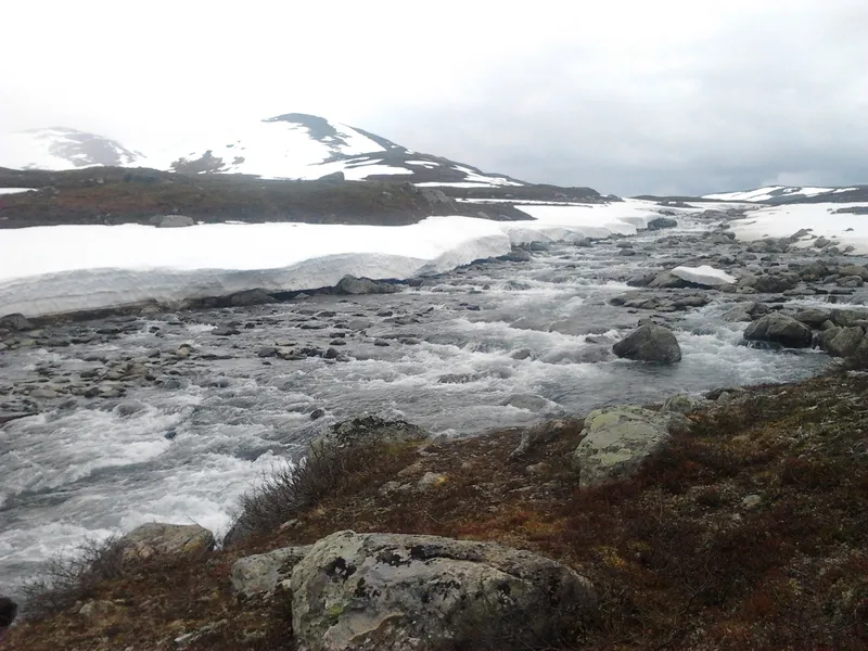 De oroliga tankarna fanns kvar i bakhuvudet. Skulle vi tvingas vända? Välja en annan dalgång med mindre snö? Även sommartid kan det vara vintrigare ju närmare Sylarna man kommer, så hur skulle det se ut bortåt Gåsen, om det var så pass illa redan här? Och hur skulle det gå för pappa, ensam i detta forsande inferno?