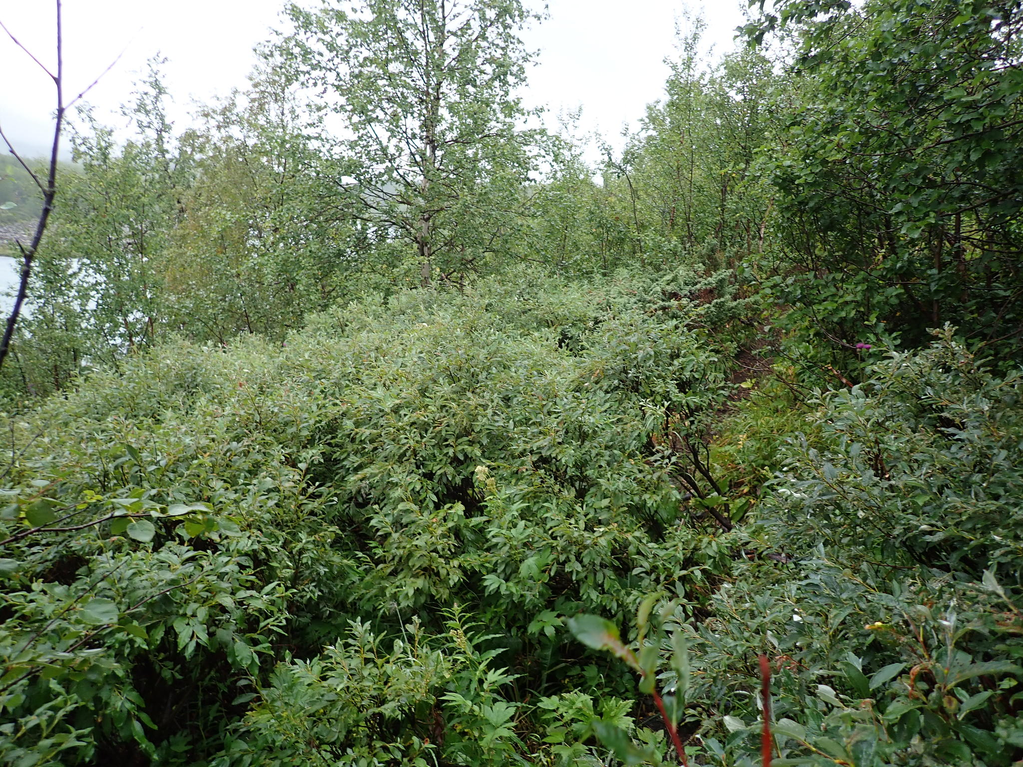 För det andra har folk alltså på allvar tagit sig över den här kanalen med vatten upp till hakan! De har vågat sig ner i det djupa vattnet med tung packning på ryggen i mynningen till den strömma älven och litat på att botten inte var gungfly. Eller kastat sina 25-kilosryggsäckar före, gett sig ner i det iskalla vattnet och över. Jag såg framför mig klassiskt fjällvandringsväder med regn och 5 grader och konstaterade att jag varken är en vattenmänniska eller bra på att kasta tunga saker långt. Jag bestämde mig för att ta de där oforcerbara snåren istället, som plan B.