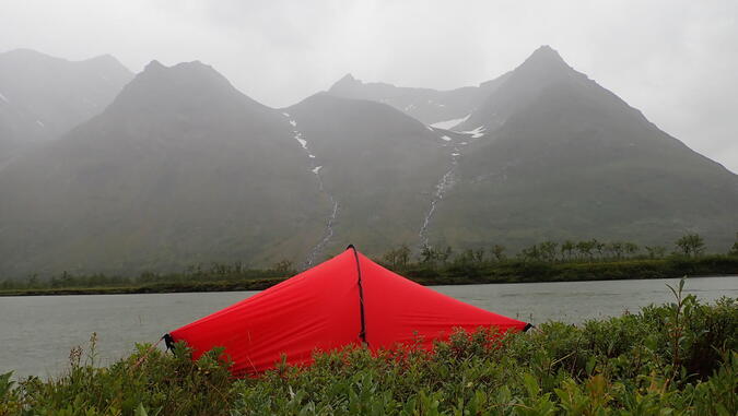 Plötsligt började det regna, rejält såg det ut att bli. Jag bestämde mig för att försöka slå nytt rekord i snabbuppsättning av tält för att slippa bli blöt - jag var för trött för det. Här längs älvkantsstigens sista bit fanns inga möjliga tältplatser överhuvudtaget, men inga människor heller, särskilt inte framåt kvällningen och i regnet tänkte jag. Så på någon minut var det uppsatt på en perfekt plätt mitt på stigen!