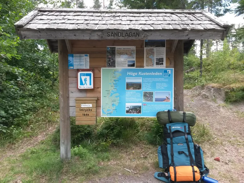 Jag som alltid tvärvägrat att följa med på vandringar (avskyr mygg och utgick ifrån att det alltid dräller av mygg på vandringar), ändrade uppfattning efter en tältnatt i ett fantastiskt vackert Lofoten förra sensommaren. Suget efter fler tältnätter i vacker natur väcktes och jag började titta runt på internet efter tips och ideer, det var så jag hittade till Utsidan. Mitt friluftsliv har tidigare bestått i lite scouting, segling med kompisar samt lite dagsturer till fots eller på vingliga ben på skidor. Men nu bestämde jag mig för att vandra några dagar på raken och valet föll på Höga Kustenleden. Eftersom jag bor mitt på en delsträcka, så tänkte jag att det var smart att börja på ett ställe där jag kunde bli upplockad om jag skulle upptäcka att det verkligen är så att det dräller av mygg på vandringar =). Bestämde mig för att starta vid Sandlågan utanför Örnsköldsvik och vandra mot hemmet beläget 2,5 etapp från ledens slut (eller början) vid Hornöberget. Allt höll dock på att avsluts innan det ens började, eftersom jag körde vilse ett flertal gånger på vägen till Sandlågan och höll på att få en hjärnblödning av irritation. Med hjälp av snälla människor på en bensinmack hittade jag till slut rätt, äventyret kunde börja!