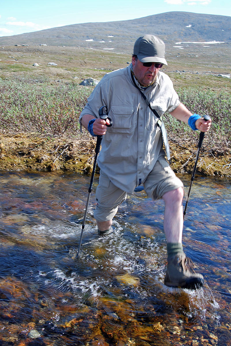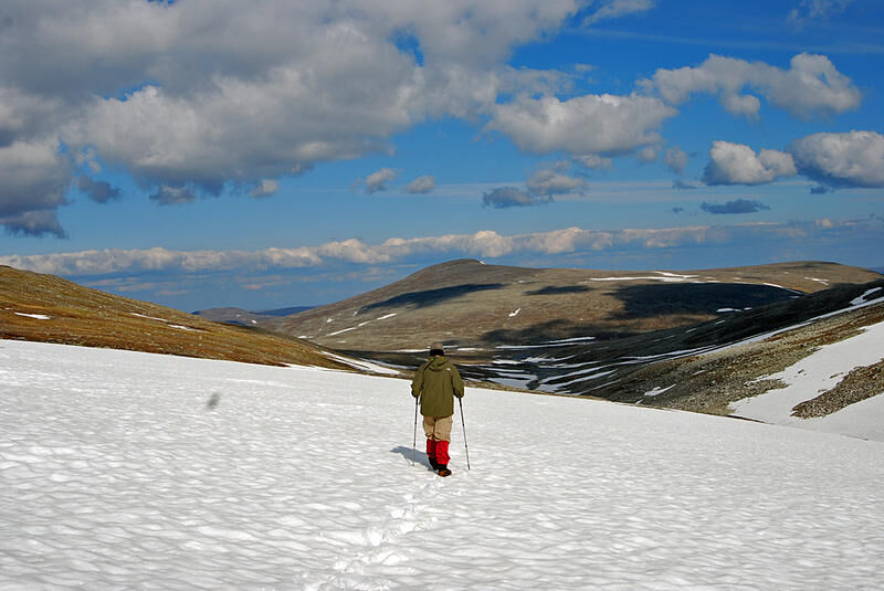 Vi tog ut kompassriktning nordöst från Slierjgetjåkkhå och jag försökte förklara för Sundip att det är bättre på alla sätt och vis att försöka hålla höjd, i stället för att bara dundra ned i en dalgång och så tvingas upp till samma nivå igen på ett betydligt mer mödosamt sätt. Sundip, med Londonbons och visionärens inställning till livet, så höll han med och dundrade direkt ned på slätten, vilket gjorde att vi fick orientera runt en stenig knöl och hamnade i en sorts myr som stank av stillastående vatten och jord. Ett gäng renar hade precis passerat förbi och lämnat sin avföring. En irriterad labb skränade och försökte hålla oss på avstånd, men solen brände, Sundip blev törstig och började filosofera runt livet, samtidigt som vi slog oss ned vid en liten bäck som skapats av snösmältningen.