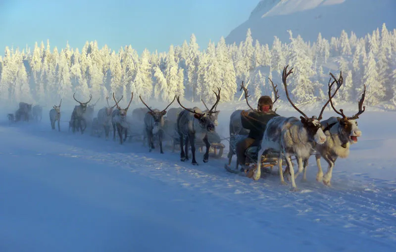 Det blev avsevärt varmare den sista veckan. Nätterna låg fortfarande under -45, men under dagarna var det ibland rena värmeböljan runt -30 grader och det gjorde att den sista biten blev bekvämare. men inte lättare. Här var taigan mycket tätare, isarna öppnare, mycket mindre snö, men likväl tillräckligt med snö att det blev skare ibland, vilket ställde till det för renarna, som har svårt att ta sig genom denna. Tänk vilken underbar varelse renen är! Än är den helt överlägsen som reskamrat i den sibiriska tajgan. Den behöver inget bränsle förutom vad som erbjuds i skogen, den kan ta sig fram där vare sig skoter, hundar eller hästar kan och den erbjuder dess mänskliga kamrater alltifrån kläder till kött. Perfekt