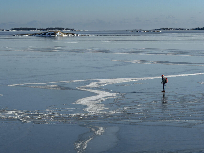 Att färdas med långfärdsskridskor genom en frusen skärgård är som att åka rakt in i en annan värld. När isen har lagt sitt lock över fjärdarna suddas gränserna ut. Landskapet ritas om och förvandlar sommarparadiset till något annorlunda. De vikar och sund som brukar gömma sig bakom uddar och holmar öppnar sig nu som inbjudande salar. Öar som på sommaren kräver en båt, blir åtkomliga för alla som vågar sig ut.