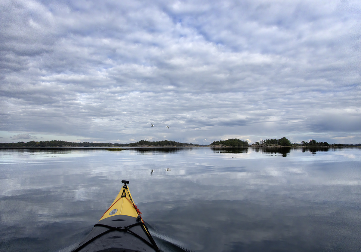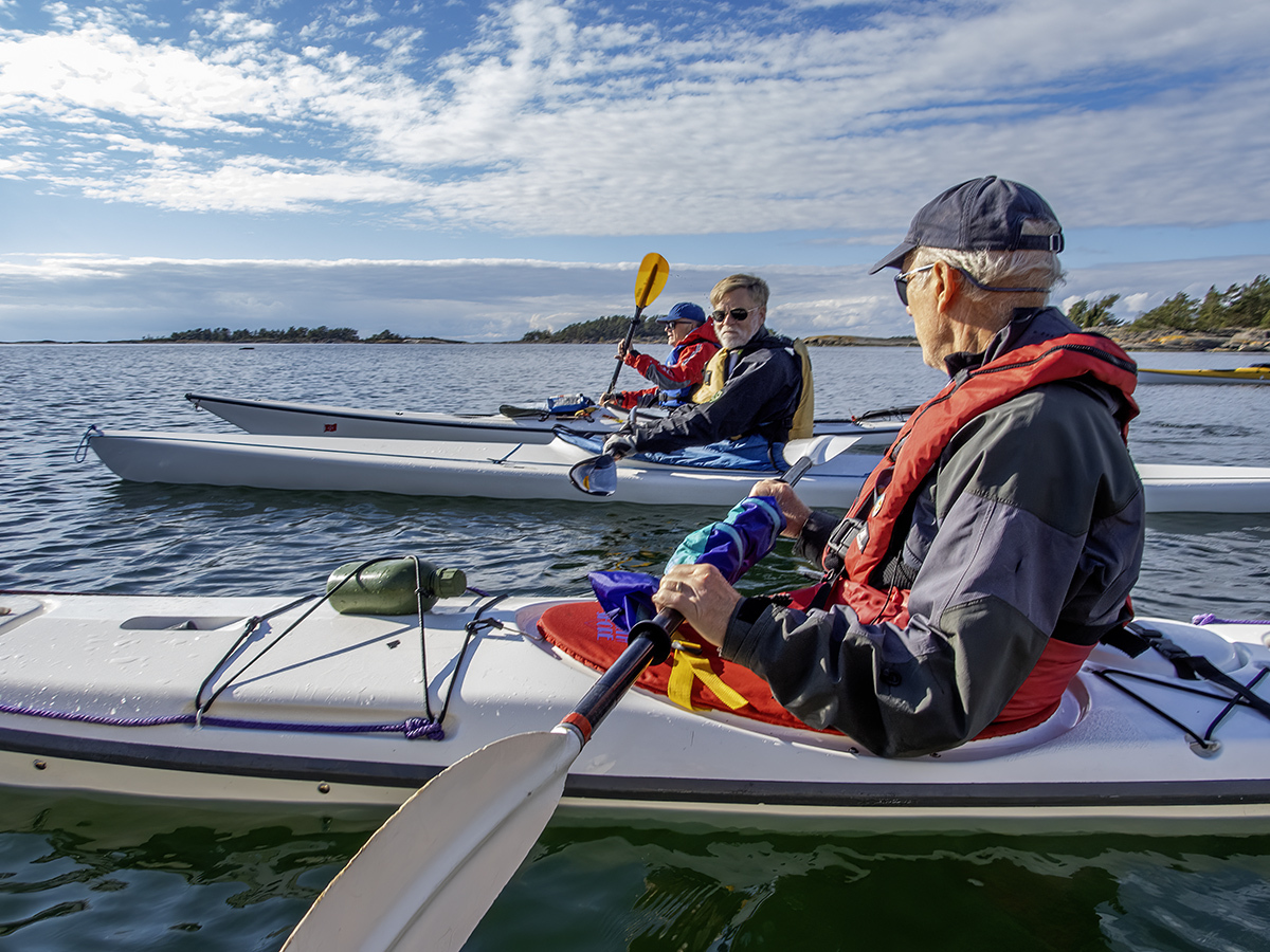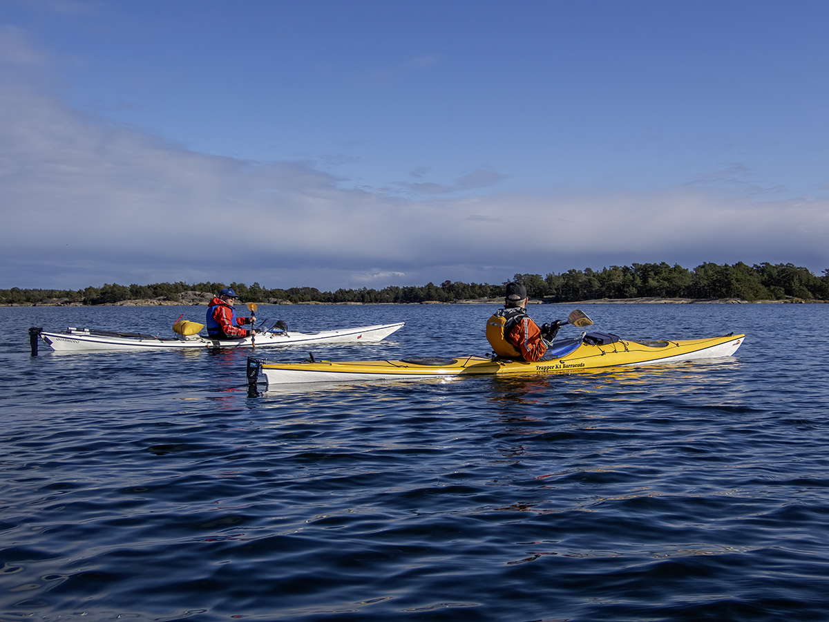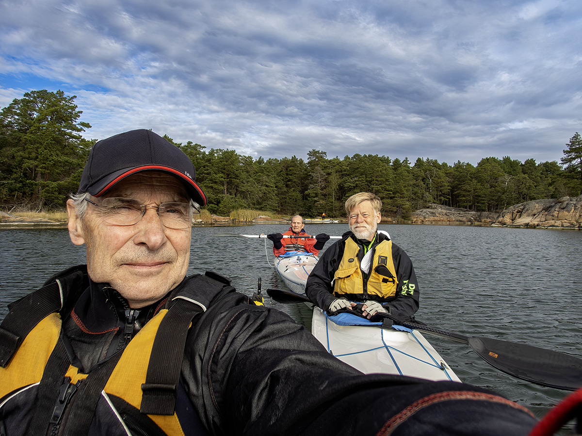 Egentligen finns det tre sorters kajakpaddlare. De som gillar utmanande vågor, de som föredrar lugna farvatten och de som gillar både och. Jag tillhör sistnämnda gruppen. Troligen gäller det även för de andra som jag paddlat med varje höst sedan millenieskiftet. Vi tar väder och vatten som det kommer. Och alltid sticker vi ut i oktober. Från början var det jämnt sista helgen i den månaden som gällde. Färden skulle vara käck och kärv på senhöstars vis. Ett obligatoriskt dopp var påbjudet i det ofrånkomligt kalla vattnet och korta dagsljuset. Sedan två år har vi ändrat stuket en aning. Nu gör vi turerna i början på oktober och får därmed lite mera dagsljus. Och det sedvanliga doppet har blivit valfritt efter behag. Det märks att gossarna blivit äldre på gamla dar.