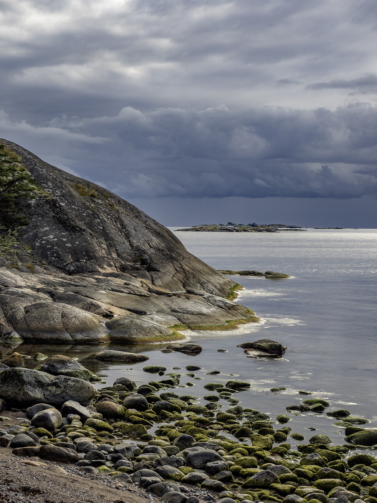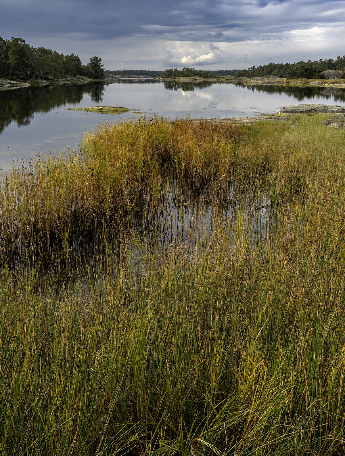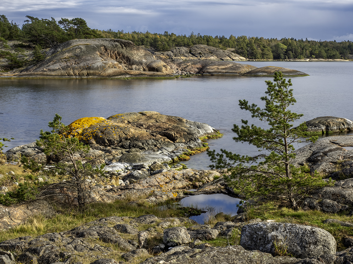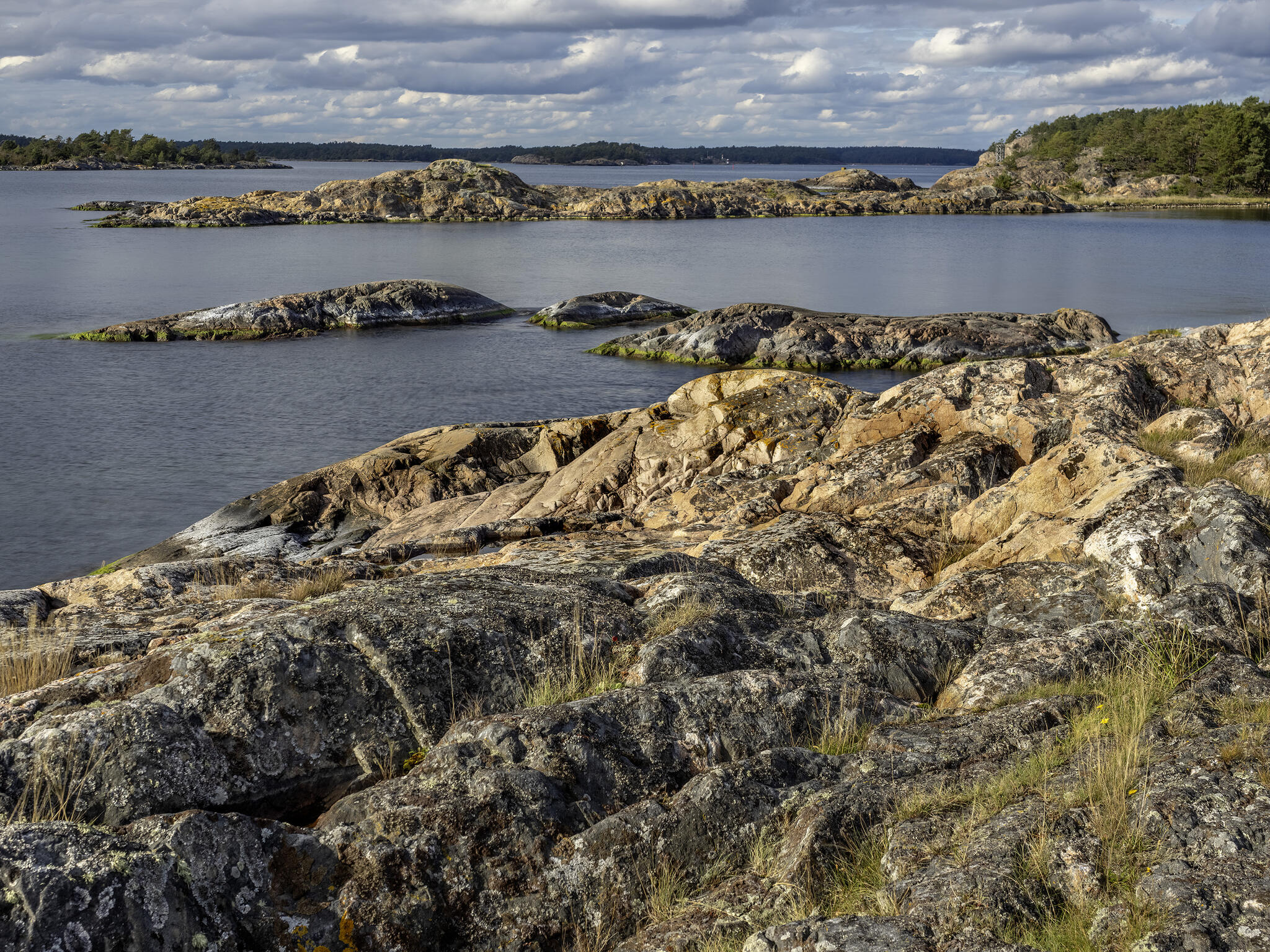 Jag passade också på att knalla runt i naturen med kameran. Några få meter bakom rastplatsen låg en liten insjö som av någon anledning kallas Sandrevlarna på kartan, möjligen för att den har en sandbotten. Ljuset mejslade fram klipporna på Ringsö utsida som kom till sin rätt. Vädret var bästa tänkbara för både paddling och fotografering, med mörka moln över havet i söder, och blå himmel ovan oss. Solskenet försvann av och till bakom en molnkant. Brytpunkten gav upphov till måleriska dagrar av det slag som romantiska skärgårdskonstnärer, typ Gottfrid Kallstenius, brukade avbilda. Jag försökte göra samma sak fast på ett enklare sätt – med kameran. Det skulle bli mer av Kallstenius stämningar på denna tur.