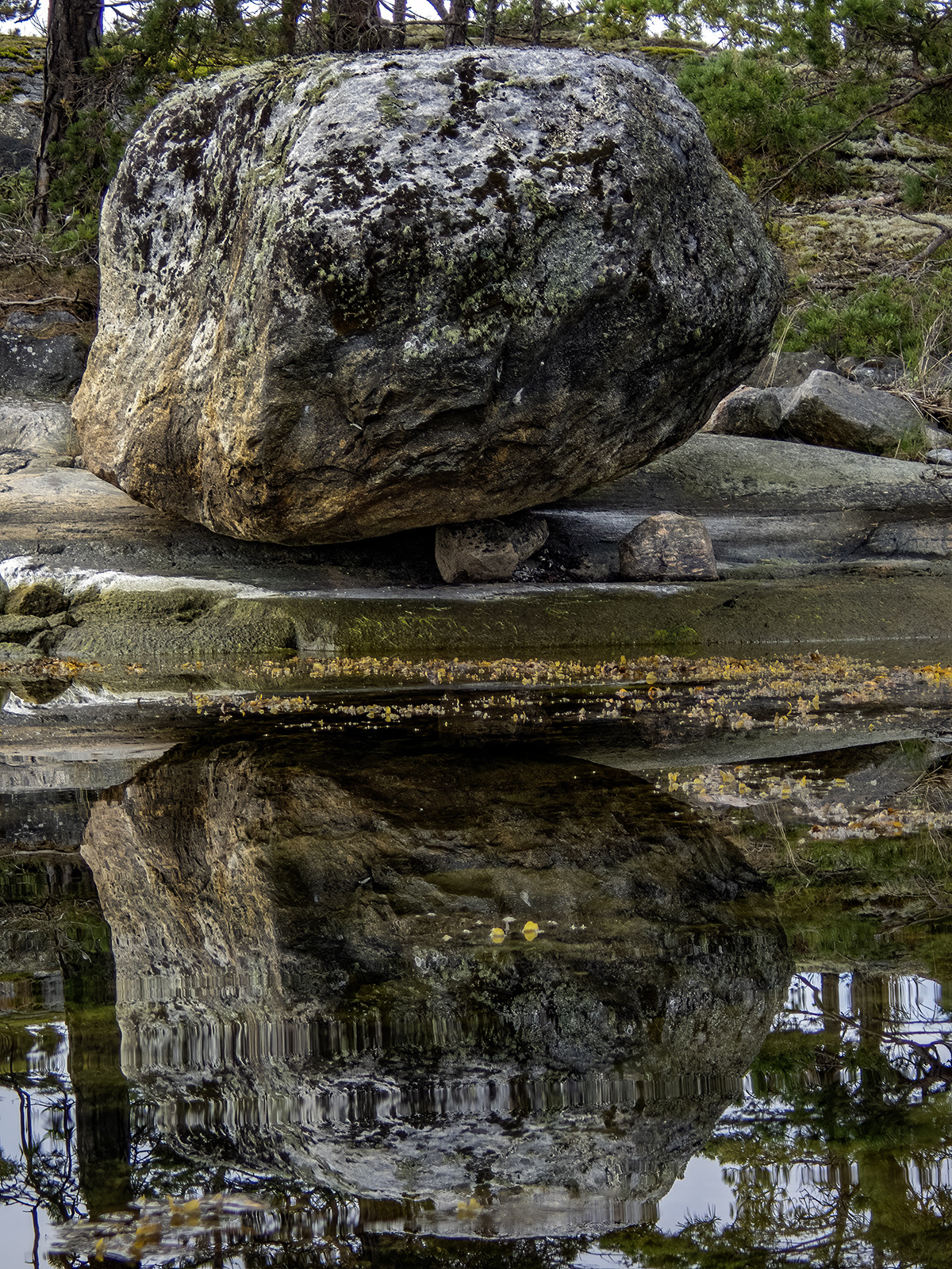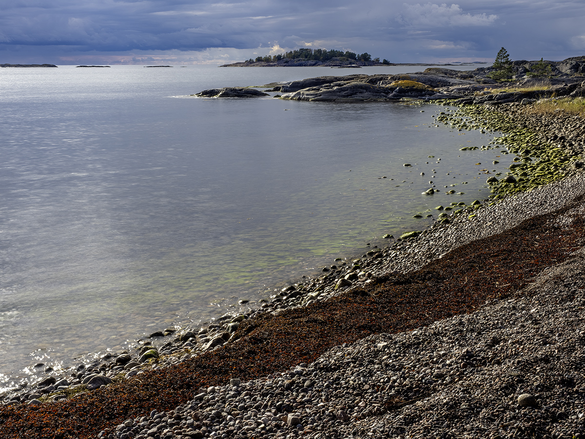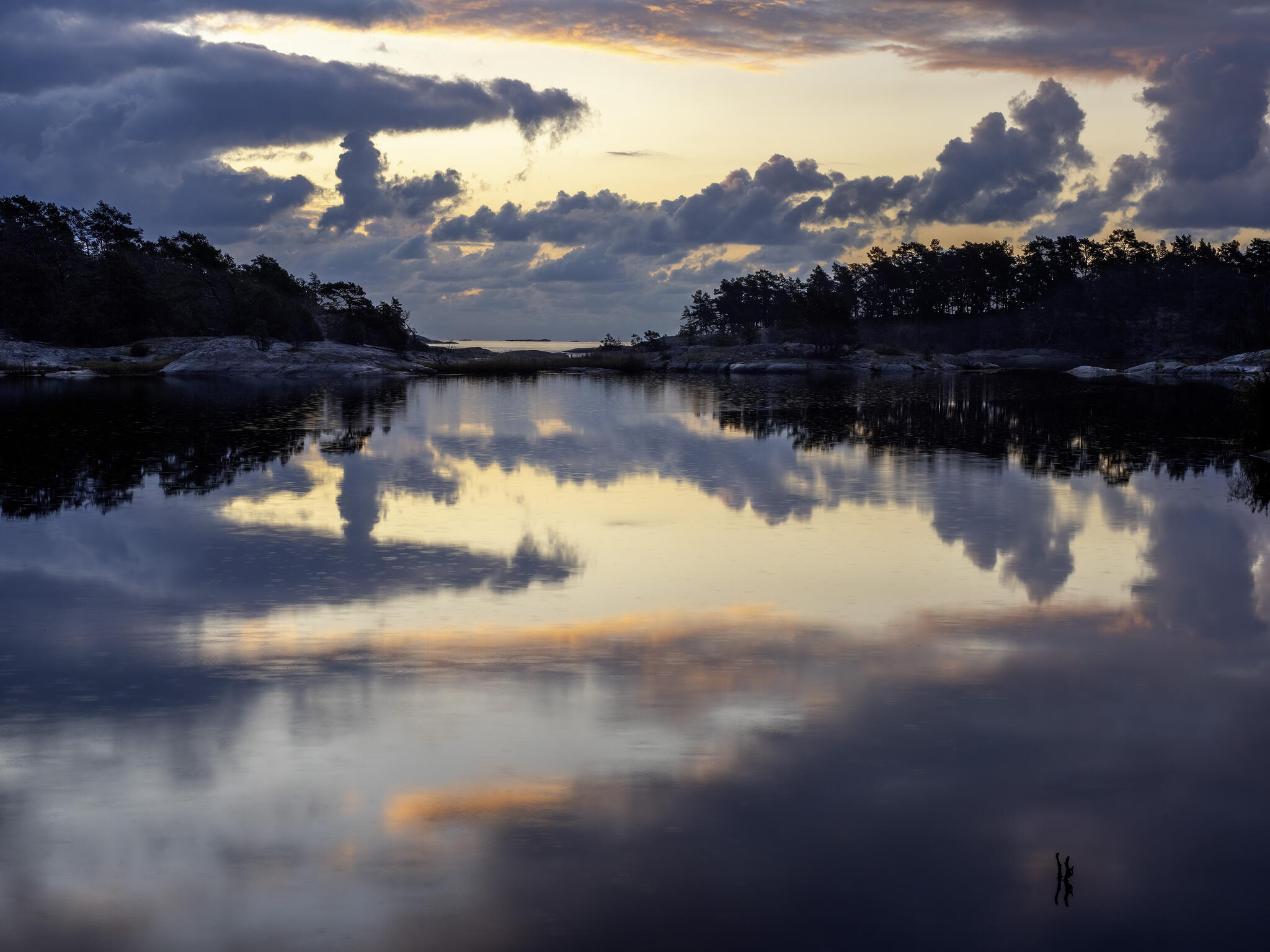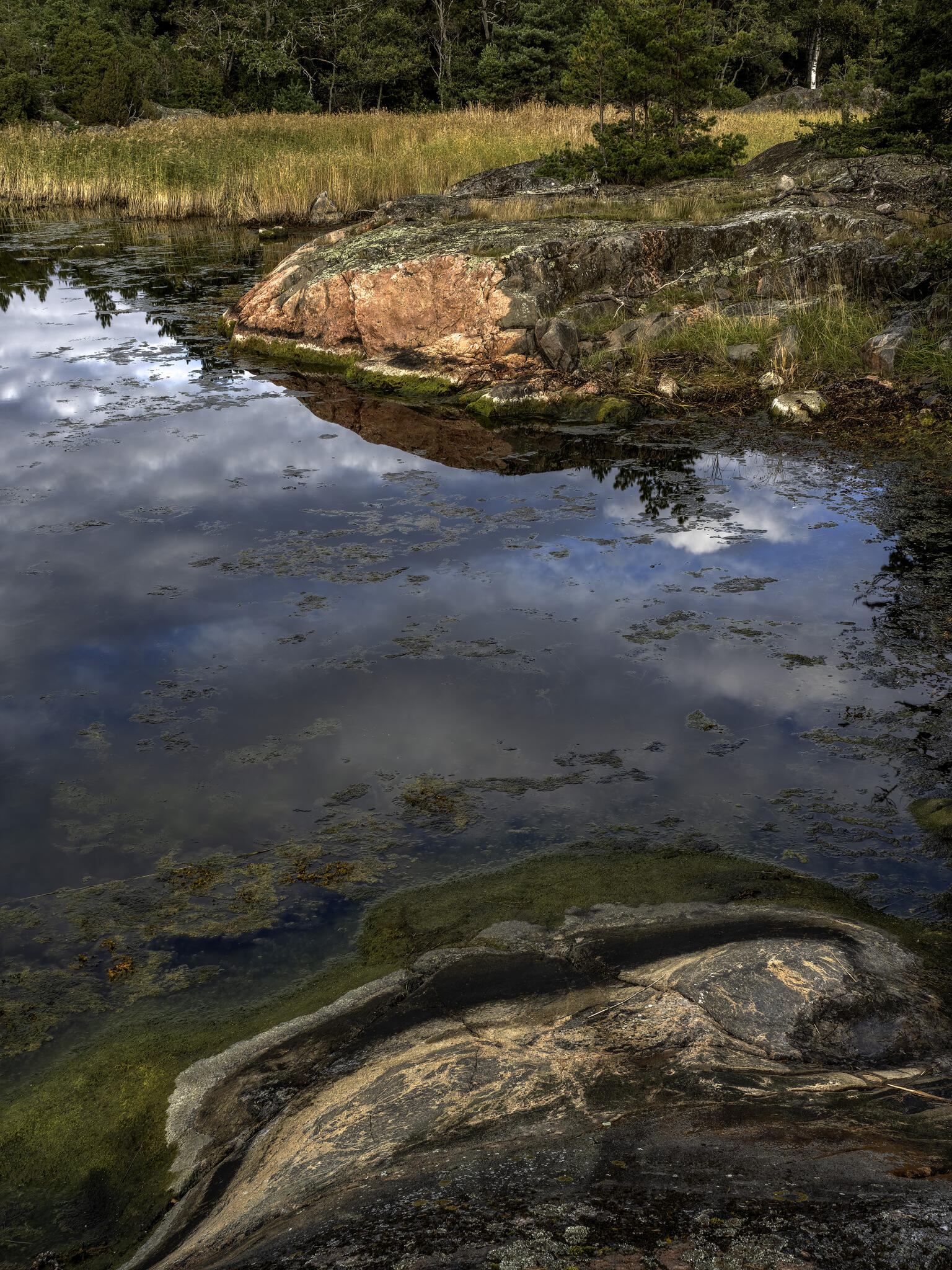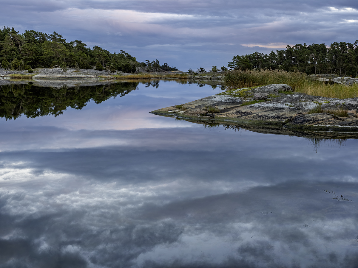 Vi rundade Hartsön och fick med det ögonkontakt med utskärgården som utkristalliserades i ett brett panorama ända bort till de mytiska kobbarna kring Garkast längst ner i söder. På de blanka vattenytorna målade molnen sina egna spegelbilder. Hänförande tavlor i ett abstrakt formspråk avlöste varandra, och abstrakt var känslan att glida fram med kajaken över dessa motiv som sprack itu och sedan återbildades. När vi till slut hade hittat en lämplig lägerplats på näset mellan Björkskär och Kidskär och tältet blivit uppsatt, behövde jag sträcka på benen. Tog kameran och vandrade runt på ön för att uppleva stämningen ur ett landbaserat perspektiv.