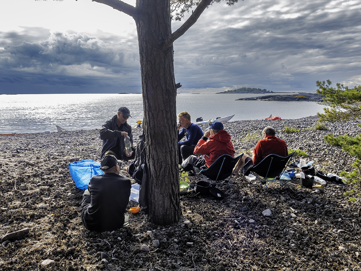 Vid Ringsö sydspets, mellan Örudden och Södra udden låg en grusig strand som blev dagens lunchplats. Ringsö är den största landplätten i denna oexploaterade skärgård. När vi kommit upp på stranden tog snacket fart – som alltid. Jag hade inte träffat någon av de andra under året som gått. Och de andra hade inte heller setts på ett tag. Det var upplagt för många snackisar.