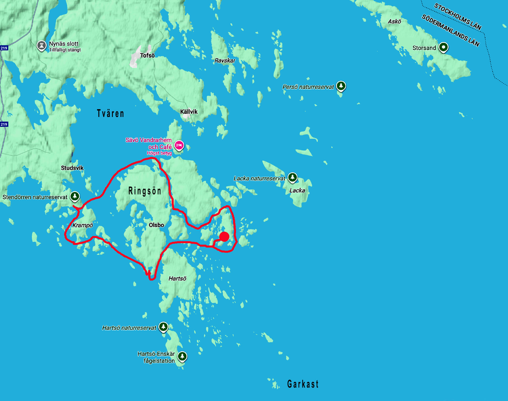 Vi smekte längs Ringsöns norra strand med Tvärens vida yta på styrbords sida. Passerade sedan in genom Stendörrens smala gatt och avslutade där vi hade börjat. Cirkeln slöts. Epilogen blev också en sorts belöning, eller snarare fin inramning. Dagen efter drog stormen Amy in över Sverige. Att paddla kajak genom skärgården i den blåsten hade varit en helt annan historia än vår lugna eskapad. Det hade knappast varit roligt ens för oss som ibland gillar utmanande vågor.