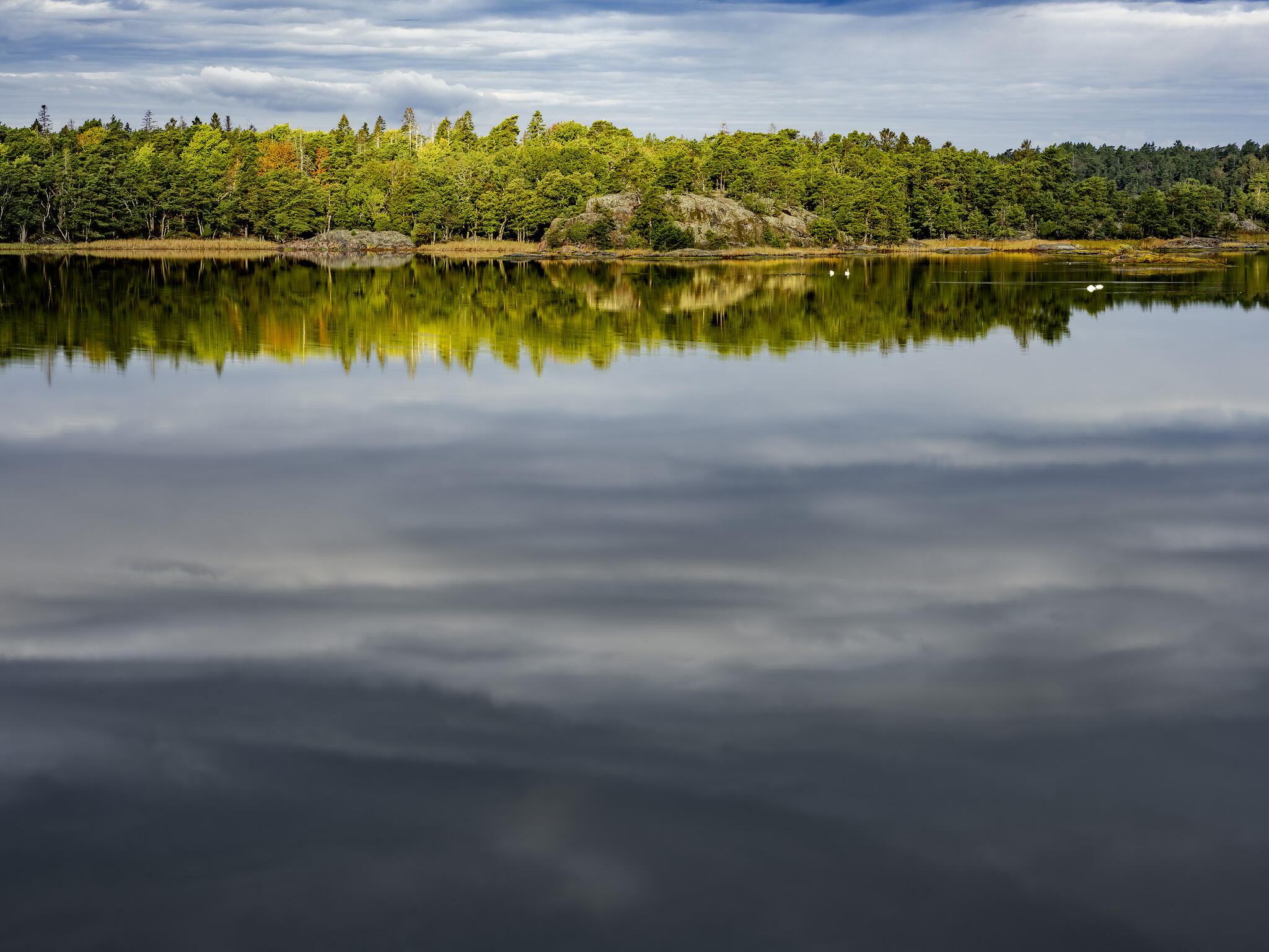 Nästa dag gav oss samma fridsamma väderlek och blickstilla spegelbilder. Vi rundade Björkskär med dessa många satellitöar; en samlad gruppering som utgör ett fridlyst fågelskyddsområde under andra delar av året. Ännu ett argument för hösten. Några knölsvanar svepte förbi. I övrigt var fågellivet mycket återhållsamt. Utåt havet blockerades horisonten av en radda holmar och skär.