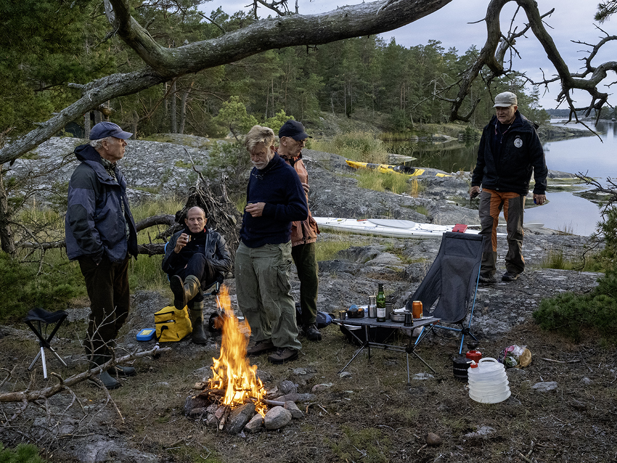 En annan härlig egenskap med denna kust är naturens plötsliga förvandling från innerskärgårdens rediga barrskogsöar till den yttre skärgårdens små och oftast kala holmar. När vi paddlade på de inre vikarna såg naturen ut som en klassisk vildmark i ett bergigt skogs- och sjölandskap. Några paddeltag senare öppnade sig havshorisonten bakom gatten mellan öarna vilket förklarade vår position. Det var verkligen ingen insjö vi befor. Tångruskorna talade sitt eget språk, medan molnen rullade över himlen och lätta regnstänk föll innan vi hittade lägerplatsen. Lagom till skymningen var det dags att dona med mat och dryck. Inget fick lämnas åt slumpen. Måltiderna brukar alltid vara heliga på dessa höstliga utfärder.