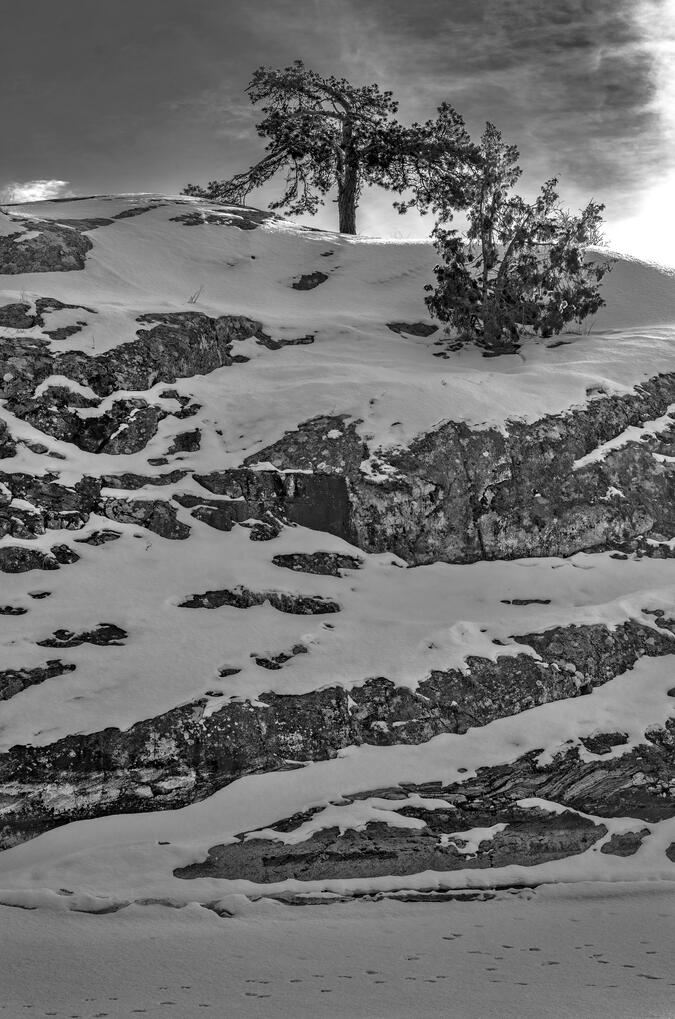 Naturen och strandklipporna är kejserligt högresta här. För vår del kryddas synen av två gamla havsörn som seglar över ön. Sedan fortsätter vi längs raden av klippiga öar. Passerar Domkyrkan på Härsö och tar oss söderut till Skräddaren för en rast. Idag är isen mestadels täckt av pudersnö, inte lika glansig som i söndags, men lika åkbar. En annan skillnad: vi är ensamma mest hela tiden. Ser någon enstaka skrinnare på håll. Det är allt och i sanningens namn - ödsligheten gör naturupplevelsen större. Vi gör en abrovinkel till Stora Jutskär, en fantasieggande profil med klippor som påminner om ryggfenan på en Stegosaurus.
