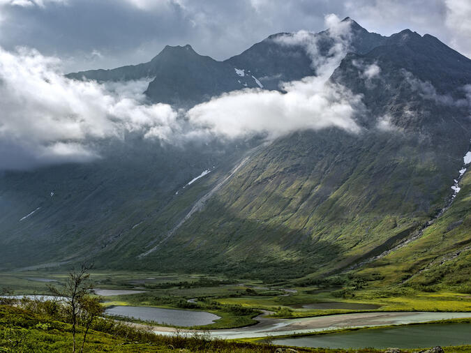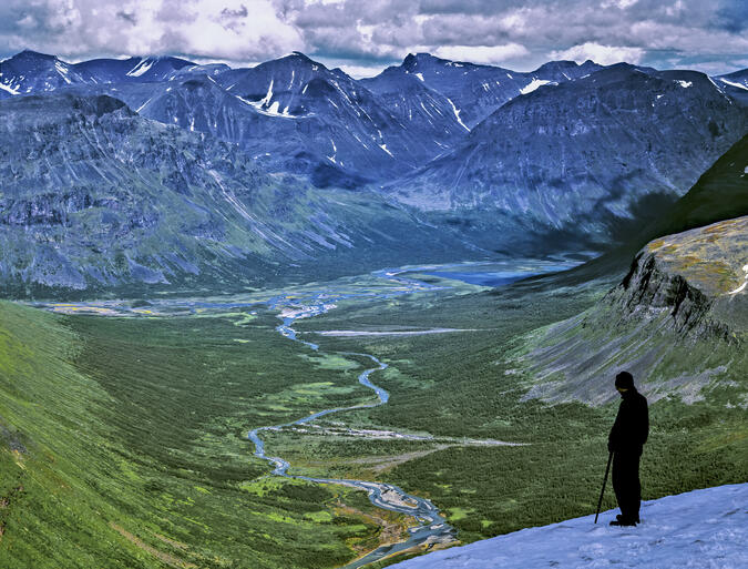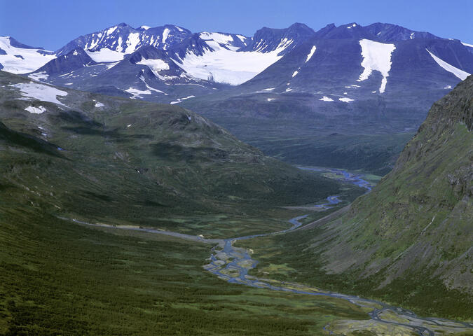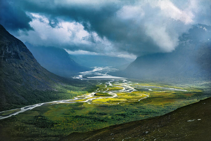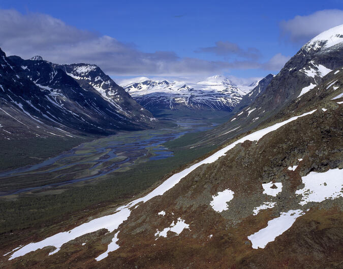Utsikten från Låddebákte visar ett koncentrat av Sarek. Den djupt inskurna dalen som är inramad av resliga berg, sammanfattar landskapets vildhet och storslagenhet. 2013.