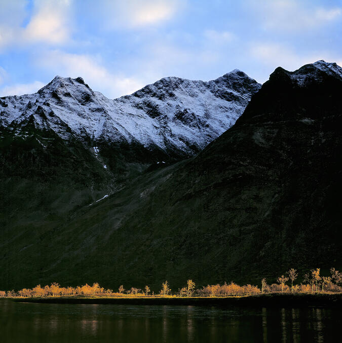 Eftermiddagssolen lyser på de höstfärgade fjällbjörkarna som en skarp strålkastare nedför de mörka klipporna hos Bielloriehppe. September 2001.