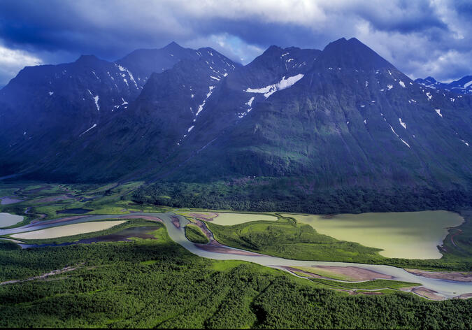 Utsikt från Låddebákte mot "rovdjurstorget" och det omtalade Telmavadet där Ráhpädna förgrenar sig. Rovdjurstorget fick sitt namn på 1960-talet då rovdjursspårarna såg stämplar i snön efter våra fyra stora rovdjur, björn, järv, varg och lo.