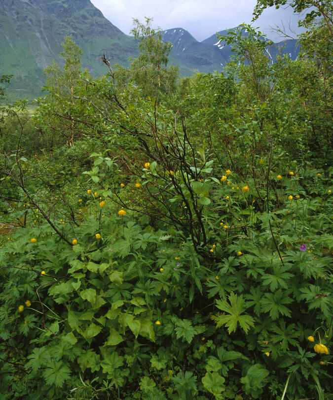Ängsbjörkskogen i Rapaselet är tät och djungellik med flera höga örter som här daldocka.