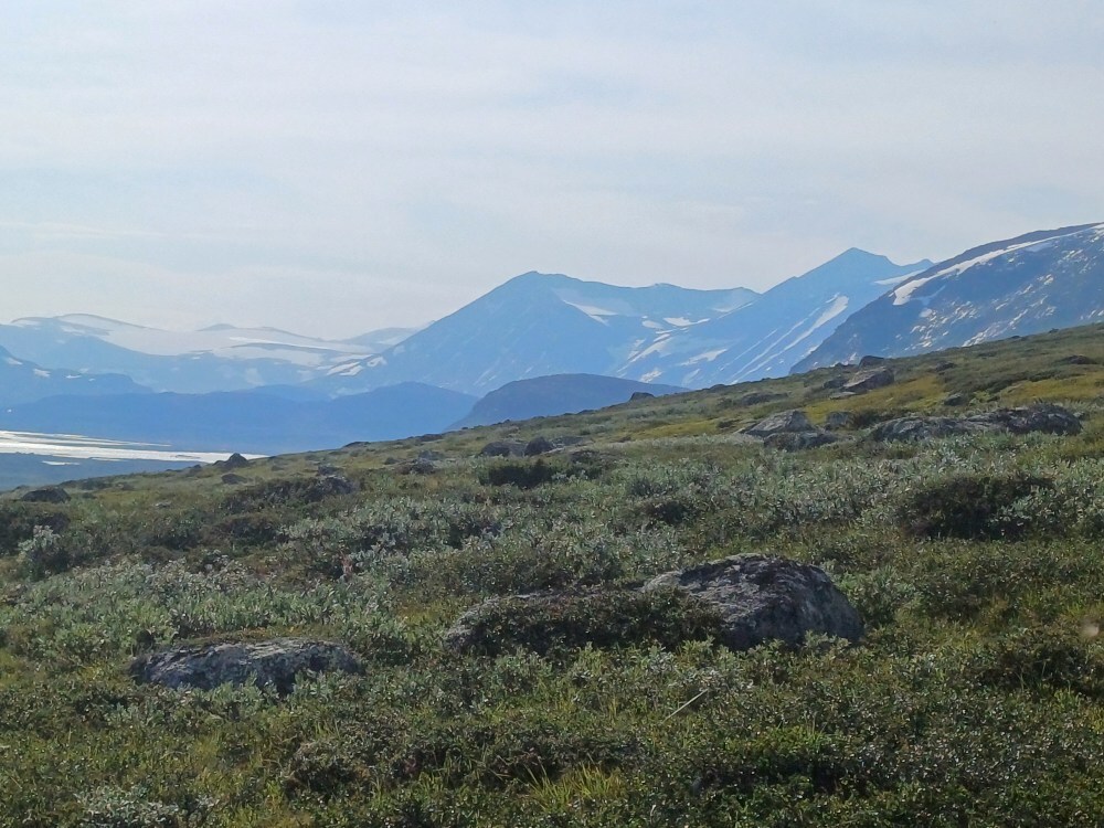 Underlaget och överlasten betyder att det går långsamt framåt. Ytterligare två vad där kängorna måste av. Varje sådan manöver tar minst en kvart och ibland det dubbla. Det är svårt att njuta av vare sig pauserna eller utsikten över porten mot Sarek. Passerar äntligen det konformade fjället Slugga som varit ett synligt landmärke sedan start. Snart öppnar sig vyerna mot högfjällen, där Ähpar med den vackra, dramatiska toppen Bierikbakte står på vakt. För fyra år sedan kom jag i motsatt riktning ungefär hit fram. Då vek vi av österut mot Saltoluokta på slutet av turen istället för att avsluta i Suorva.