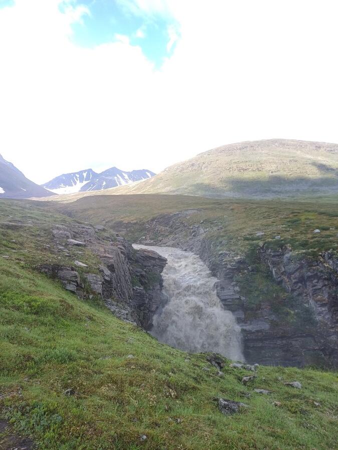 Ren och vederkvickt följer jag stigen längs Smailajåhkhå tillbaka och får det bästa perspektivet över kanjonen. Det blir en rejäl kontrast mot förra gången jag stod på samma plats och såg forsen glimrande i blågrönt. I dag är vattnet smutsbrunt och fullt av det som slipar klippan rund. Berget spyr ut sig en kokande sörja och flödet kan, av den som inte vet att det är tidigt i augusti, misstas för vårfloden.